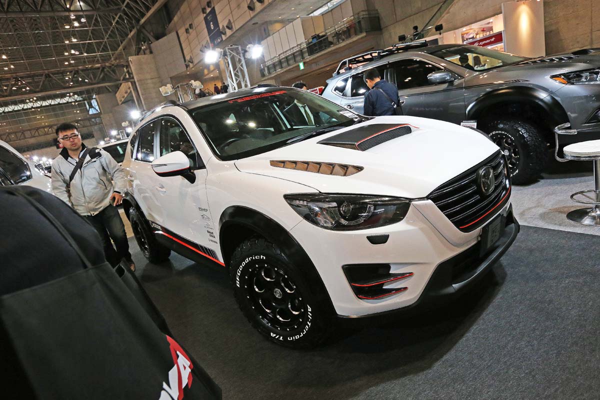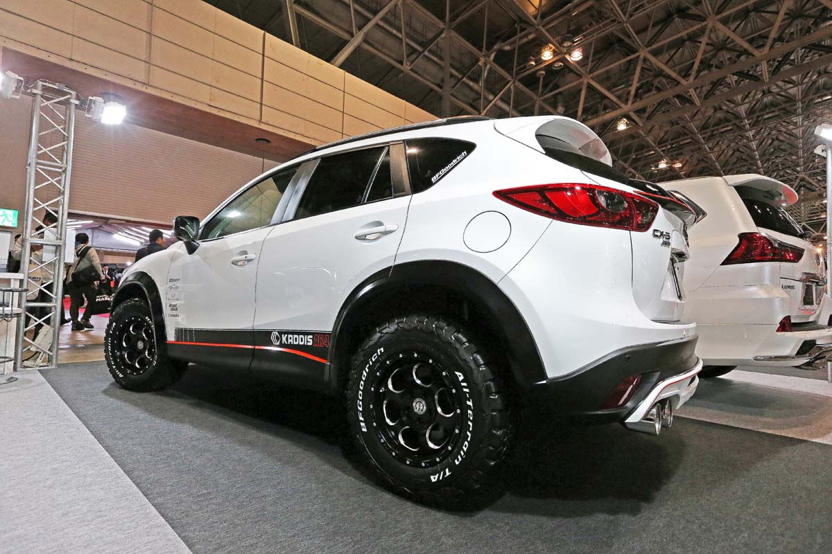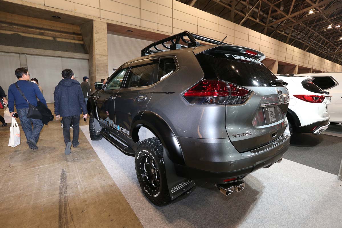 雖然說國內對於車輛法規只準避震器降低而不能升高,但是在法規相對嚴謹卻也開放改裝的日本市場,許多需要進行戶外越野的車輛其實更需要透過升高車體來滿足使用環境,就算是都會型SUV也能夠辦到,就像眼前這兩輛XTREME X-Trial 32與AR4 CX-5,透過Kaddis所推出的Off Road套件輕鬆將車輛提升5.5英寸,而配合相對艱困而危險的越野環境需求,X-Trial 32額外在前保桿追加防撞桿,另外車身兩側也同樣加裝防撞桿及四輪輪拱,配合上車頂置物架,看起來格外具有越野風範。至於AR4 CX-5外觀則是融入些許的性能味,開孔引擎蓋配合全車適度紅色折現點綴以營造不同的風格。