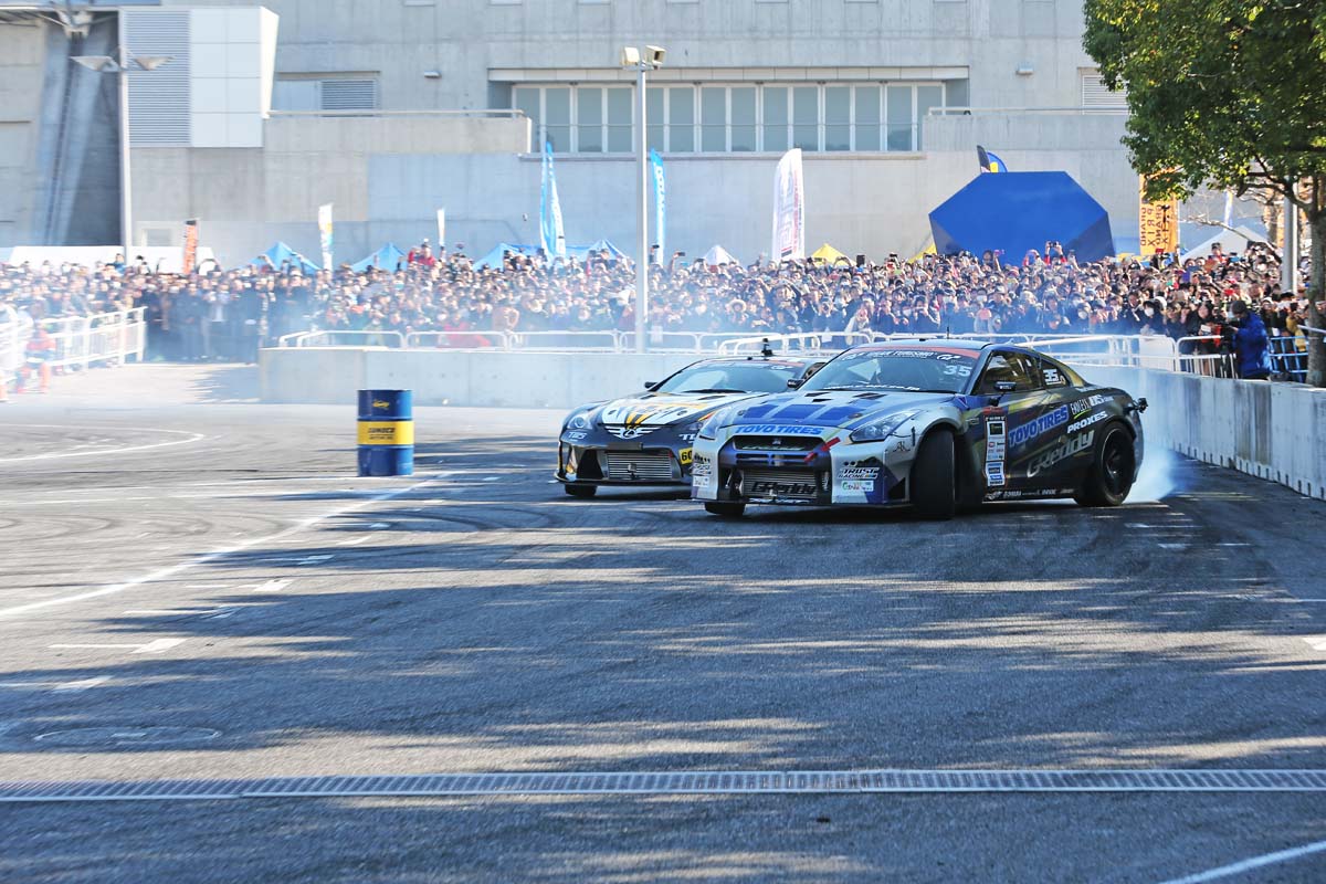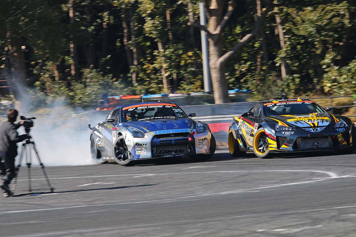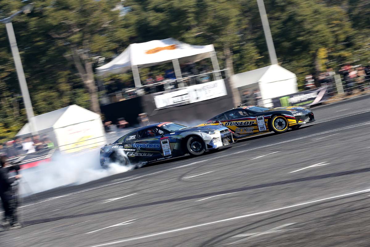 超過4位數的動力及3位數的扭力,並且搭配夠大的排氣量及序列式直齒變速箱,在東京改裝車展這個低速賽道內,一個起步換上3檔,手煞車輕點一下車尾帶出後連離合器都不用踹,踏下油門後輪就開始瘋狂的旋轉,光是單走狀態進入2號彎前就已經是火燒車狀態,追走時的煙霧更是相當誇張,無論是川火田真人還是金村楊一兩位選手,都是擁有D1 GP年度冠軍的資歷,並且隸屬不同車隊,就算表演賽似乎也是玩真的,兩車最近時的距離大概只能塞進一張紙,有時甚至還會故意觸碰對方車輛挑性,這些動作對於D1 GP車手來都是稀鬆平常,就像是兩個大男人在打打鬧鬧般。