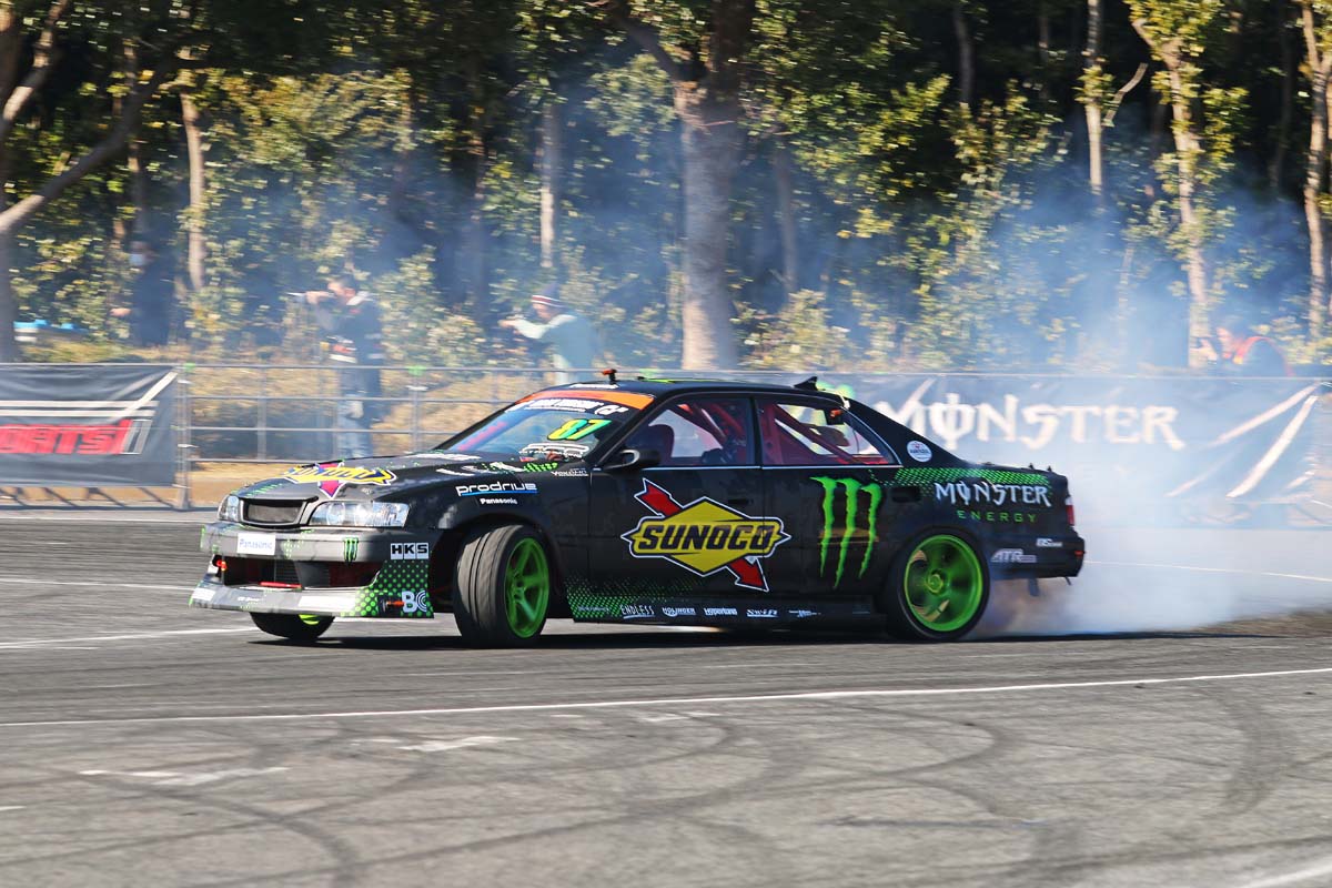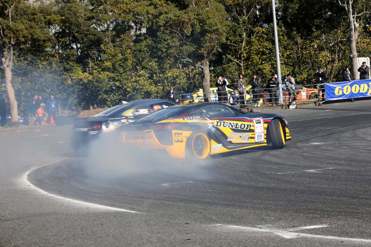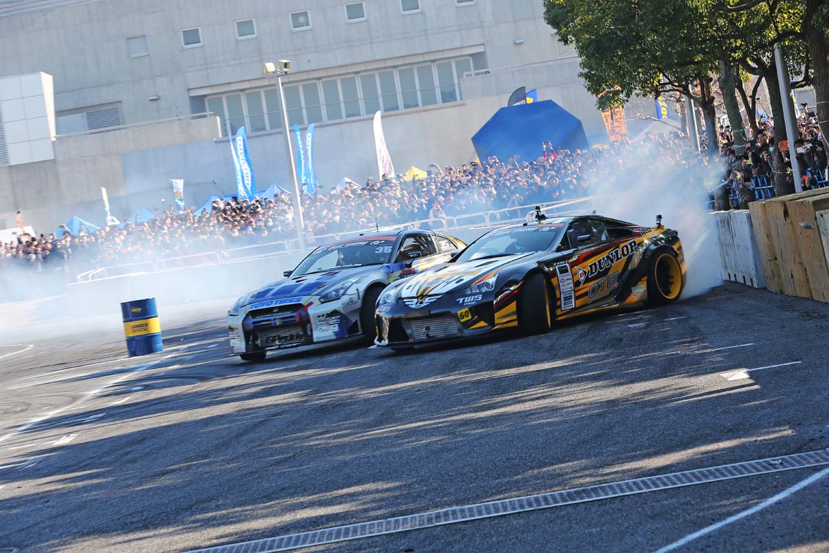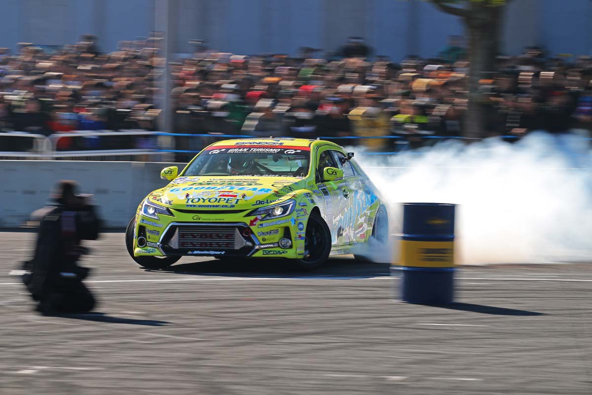 超過4位數的動力及3位數的扭力,並且搭配夠大的排氣量及序列式直齒變速箱,在東京改裝車展這個低速賽道內,一個起步換上3檔,手煞車輕點一下車尾帶出後連離合器都不用踹,踏下油門後輪就開始瘋狂的旋轉,光是單走狀態進入2號彎前就已經是火燒車狀態,追走時的煙霧更是相當誇張,無論是川火田真人還是金村楊一兩位選手,都是擁有D1 GP年度冠軍的資歷,並且隸屬不同車隊,就算表演賽似乎也是玩真的,兩車最近時的距離大概只能塞進一張紙,有時甚至還會故意觸碰對方車輛挑性,這些動作對於D1 GP車手來都是稀鬆平常,就像是兩個大男人在打打鬧鬧般。