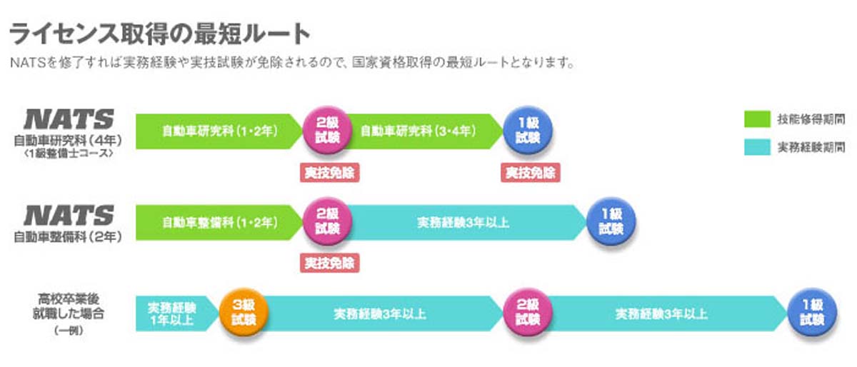 NATS自動車學校來說,除了基本上述的Customize、Motorsports、車輛研究4大科系外,在日本證照的取得也有一定的流程,基本上可以分為3級、2級與1級三種等級的證照,筆者大概整理一下取得方式,來給有興趣入學的讀者,另外想要就讀NATS除了需要日文檢定2級以上的能力外,學校也會有1對1的入學面試,確認學生對於車輛的熱愛。