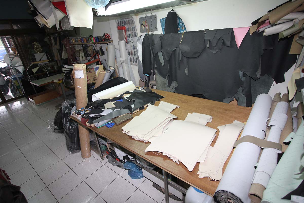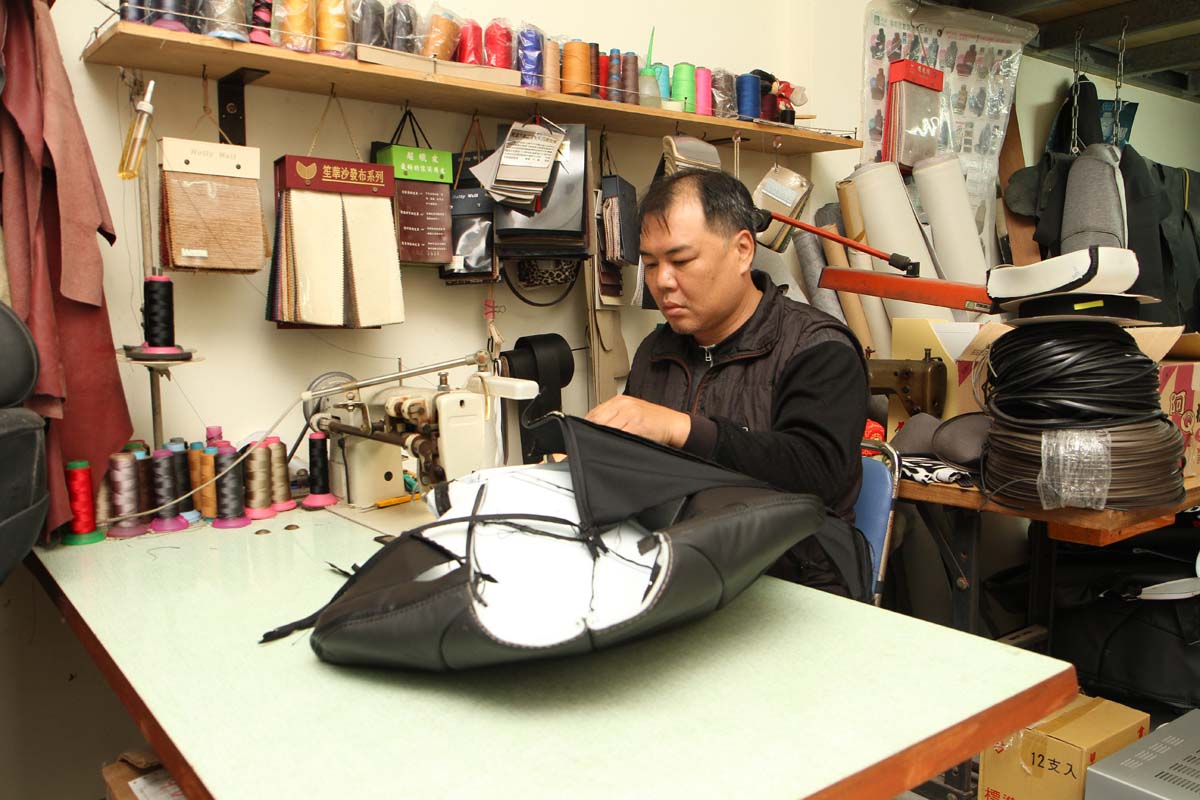 | 圖為車泰皮椅店內的擺設,比較近的工作桌上放置的是各種車型座椅的樣板,可製作皮料起來,等待車主前來翻修,可節省車主時間,牆上則掛著各種皮料,讓車主依據預算來挑選適合的皮料。 |