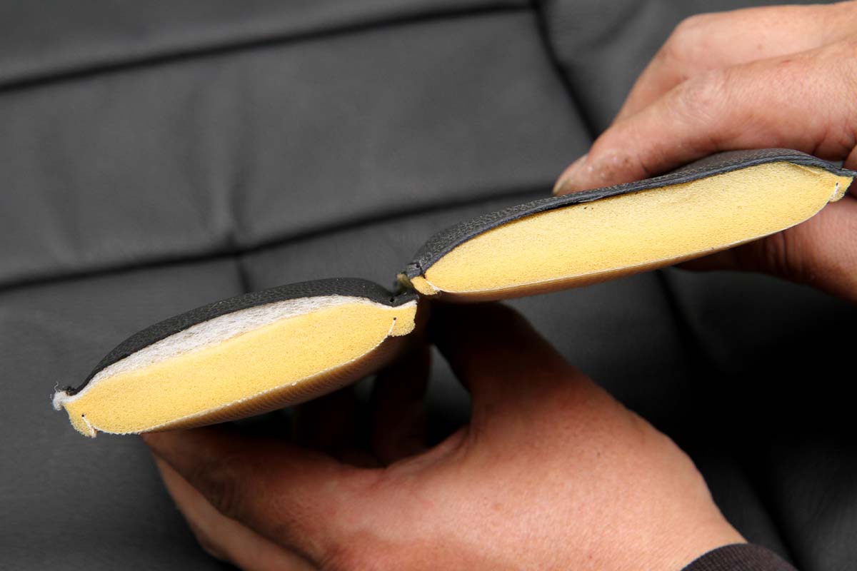 | 影響乘坐舒適性的泡棉是與皮料縫在一起的這層泡棉,而非定型用的硬泡棉,如果客人需要厚一點的乘坐性,車泰還會刻意更換厚度更厚的泡棉,讓車主坐起來如同家用沙發一樣的感覺。 |