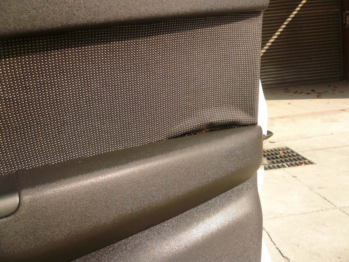 另外,許多國產車固定門板與車門的背面扣環,同樣會因為設計不良或使用材質不耐用而脆化,無法將門板牢牢固定在車門上,而產生異音,甚至出現只要稍微用力從車內拉車門,整塊門板就會掉下來。至於,門板表面包覆的絨布,同樣也會出現黏膠失效剝離的狀況。