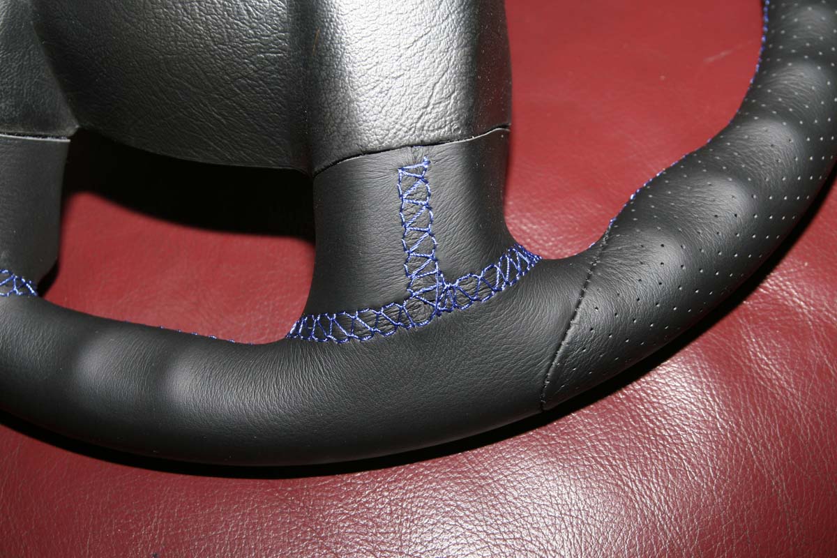 | 破損的方向盤皮面可透過重新包覆的方式來翻修,且縫線還可依照車主需求進行更換,至於手藝好不好,從縫線收尾處就可看出端倪。 |