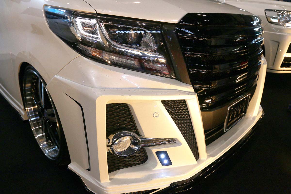 在日本當地Alphard的孿生車型:Vellfire,算是當地非常受重視的Minivan車型之一,除了配備與價格上的差異,車型大小幾乎相差無幾,這也使得日本改裝品牌都會針對這兩款車推出專屬空力套件升級,不過若不仔細看很容易就會誤認。首先為了不破壞原有的空力外觀,可以看到M`Z Speed特別利用原廠外觀而重新開發中包,這樣一來如果要恢復原廠外觀也就變得簡單許多,不過雖然換裝幅度並不大,但是所推出的空力套件採用極為誇的進氣壩,透過兩側與向下延伸的擾流,與原本的水箱護罩相呼應,就連原廠霧燈都能完全保留,另外結合LED日行燈雖然燈的數量並不多,所呈現出的高調姿態還能兼顧質感。
