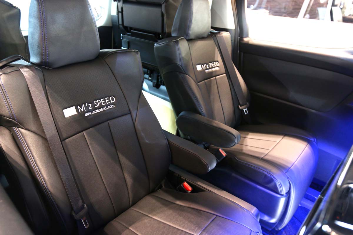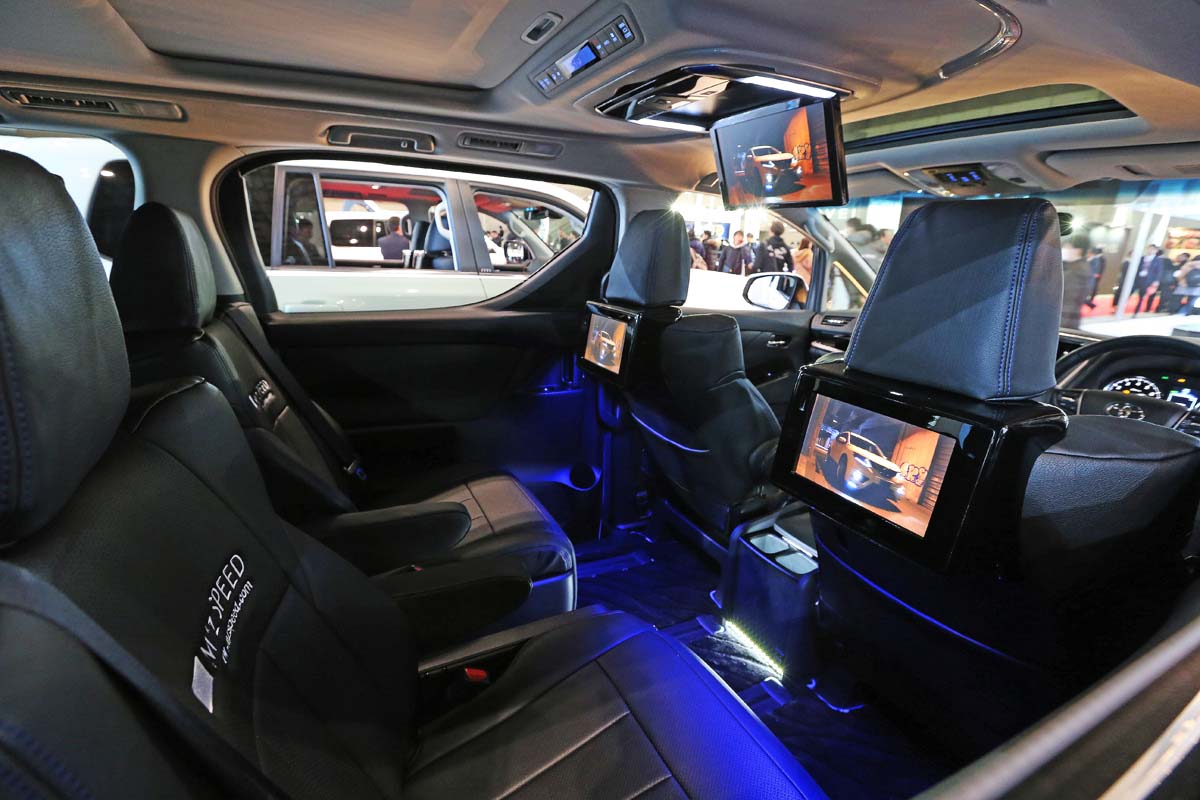 配合外觀上的變化,透過氣壓式避震器將車身降低之後,眼看就是一輛標準的VIP Minivan,不過為了整體完整性,鋁圈也換上22吋製品,利用黑銀雙色與雙片輪圈對鎖螺絲,輕鬆展現Minivan極為奢華的一面。而寬敞的車室空間當然是Minivan最受愛戴的優點,這部分當然也是改裝的重點。為此M`Z Speed將座椅、車門飾板、方向盤套等,全數使用深色透氣皮革布料重新包覆,感覺跟坐在家裡沙發上一樣舒服,另外除了基本的餐桌與影音系統等,為了增加座艙的前衛氛圍,透過藍色冷光所打造的間接照明,彷彿就像是來到夜店讓乘客都不想下車了。