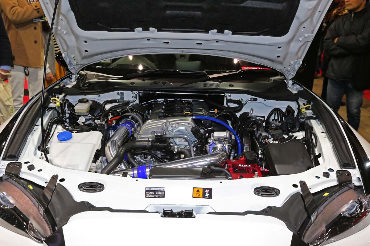 既然Blitz是以KKK渦輪機販售起家,當然目前日本最夯的Fun Car MX5就要給它塞入一顆渦輪來提升動力,不過目前電腦的部分雖然已經有原廠撰寫方式可以解套,不過目前都還在嘗試的階段,因為是全新車型所以任誰也抓不準P5-VP這顆1.5升的SKYACTIV-G引擎會發生什麼狀況,因此就連機油冷卻器的走法及厚度也都與渦輪增壓系統處於試做的測試階段,不過根據海外部人員表示,目標設定約160hp搭配上不到1000kg的車重來說已經相當充足。