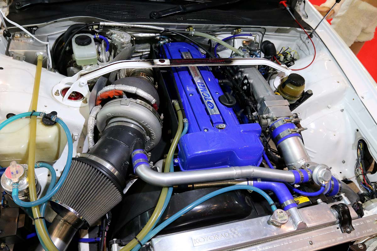 面對其餘像是R35還是V8引擎的扭力怪獸,就算已經植入2JZ-GTE也還是略遜一籌,因此東名Power替這輛車換上去年全新研發的3.6升套件,透過87x100mm的缸徑x衝程,將2997c.c.排氣量一舉提升到3565c.c.,上半座則是更換上進260度/排270度高角度凸輪軸,在壓縮比設定在8.8:1的條件下,搭配Garrett渦輪機施以1.8bar的增壓值設定,供油系統則以6支1000c.c.噴油嘴與雙Bosch泵浦輔助,目前最大出力可達800ps/6500rpm,90kgm/4500rpm的驚人範圍,並且可看到將近3位數的扭力在4500rpm即可發生,這就是東名Power 將2JZ-GTE施以3.6升化的主要用意,而這輛車在Formula Drift Japan 2015年的賽季中也拿下總成績第6位的不錯表現。