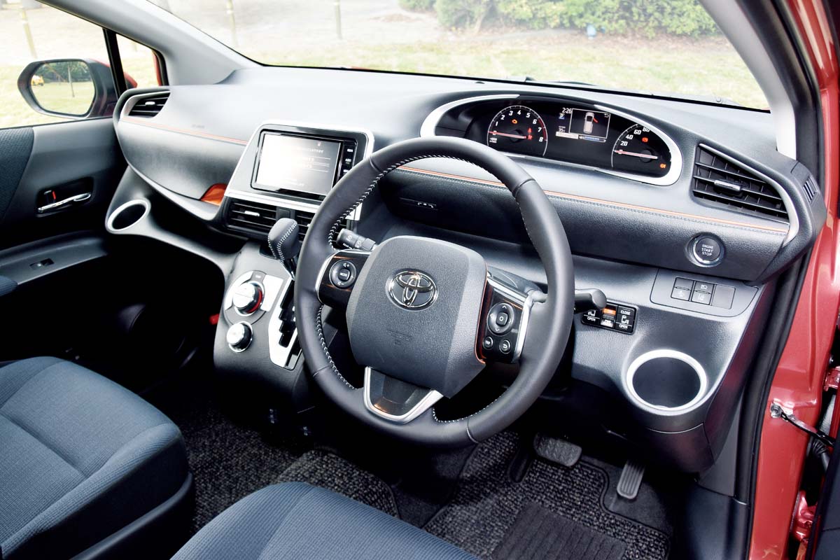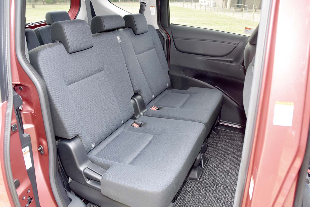 Sienta的座椅採用劇院式鋪陳,從第二排到第三排的乘坐位置逐漸升高,因此即便坐在第三排的視野也很好,但這點亦取決於第二排座椅上的乘客體型,不能一概而論。要進入第三排座椅須先折起第二排座椅;坐在第三排座椅時的腿部空間會稍嫌不足,這時只要把第二排座椅稍微往前滑一點就能改善。然而,如果先把第二排座椅往前滑再折起時因為會頂到前座,所以只能折到一半,反而降低了第三排上下車的方便性,因此當第二排座椅的乘客要下車時,最好先把座椅往後滑一點再往前折,這樣或許會有點麻煩。除了方便性之外,第三排座椅的乘坐舒適性其實感覺不到什麼缺點,唯一一點就是會比坐在第二排座椅更能聽到輪胎的噪音。純汽油引擎前輪驅動版本在JC08模式下,油耗為每公升20.2~20.6公里,油電版本則達到每公升27.2公里。儘管油電版本有稅金方面的優勢,但若要以這點來消弭價差,恐怕還是不容易。