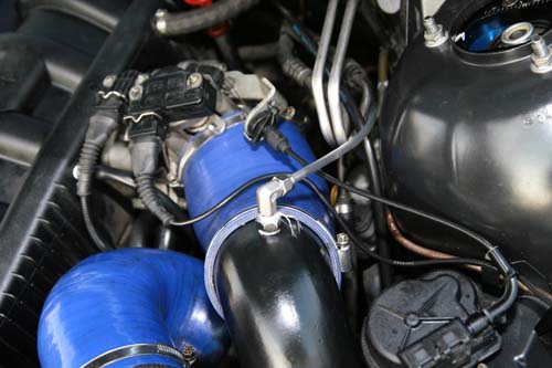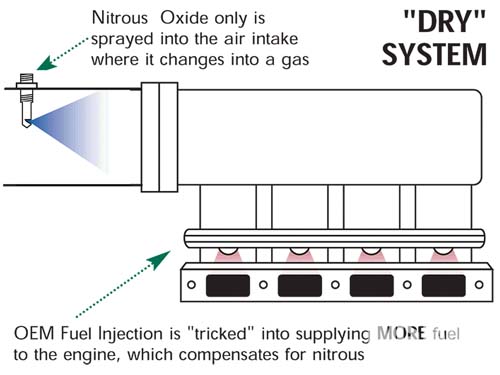從此圖中不難看出NOS系統的噴嘴是安裝在進氣歧管前,且是一進一出的噴嘴,也就是說此噴嘴只負責噴射一氧化二氮,至於供油補正則交由原廠噴油嘴來達成,這就是乾式NOS系統的概要說明,乾式系統的瞬間加速效果比較好,因此比較適合運用在直線加速賽的車輛上。