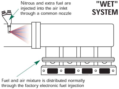 與上圖不同的是NOS噴嘴乃採用二進一出的型式,目的在混合燃油與一氧化二氮於噴嘴內後,再注入引擎內,由於噴出的氣體內即包含液態燃油,因此才會以濕式系統稱之,該系統相對於乾式系統而言,雖然瞬間加速的效果比較沒有那麼暴力,但由於噴入的NOS中,包含著保護引擎壽命所需的汽油補正,因此較能確保引擎耐用度,也較適合運用在街車改裝上。