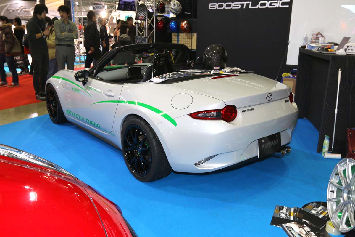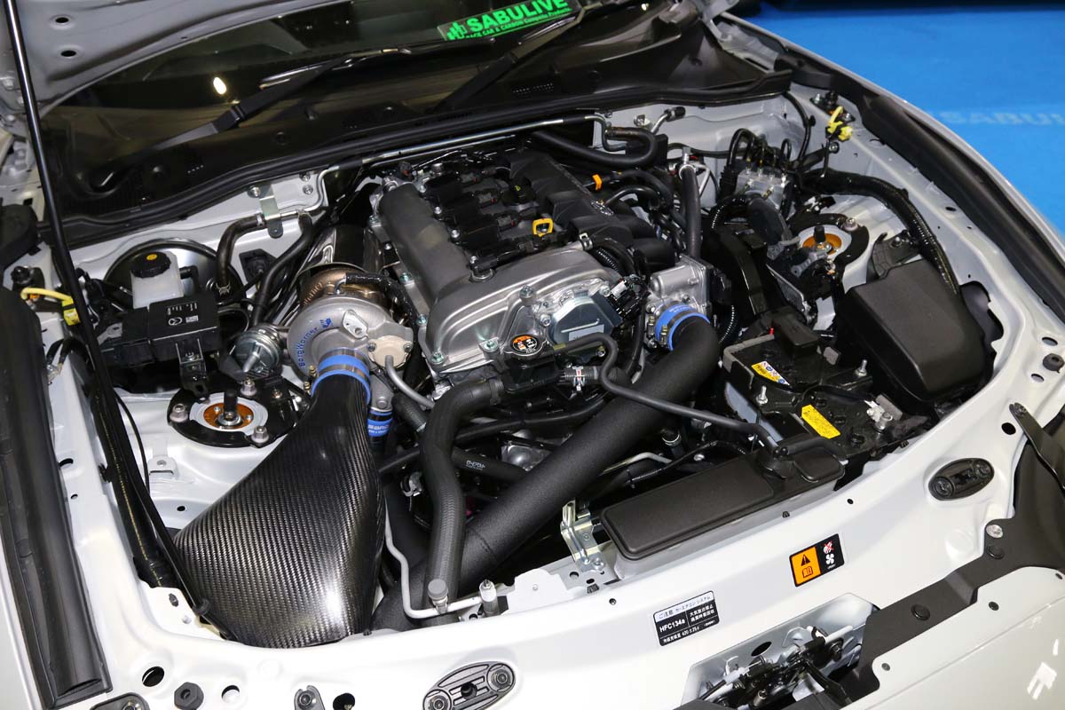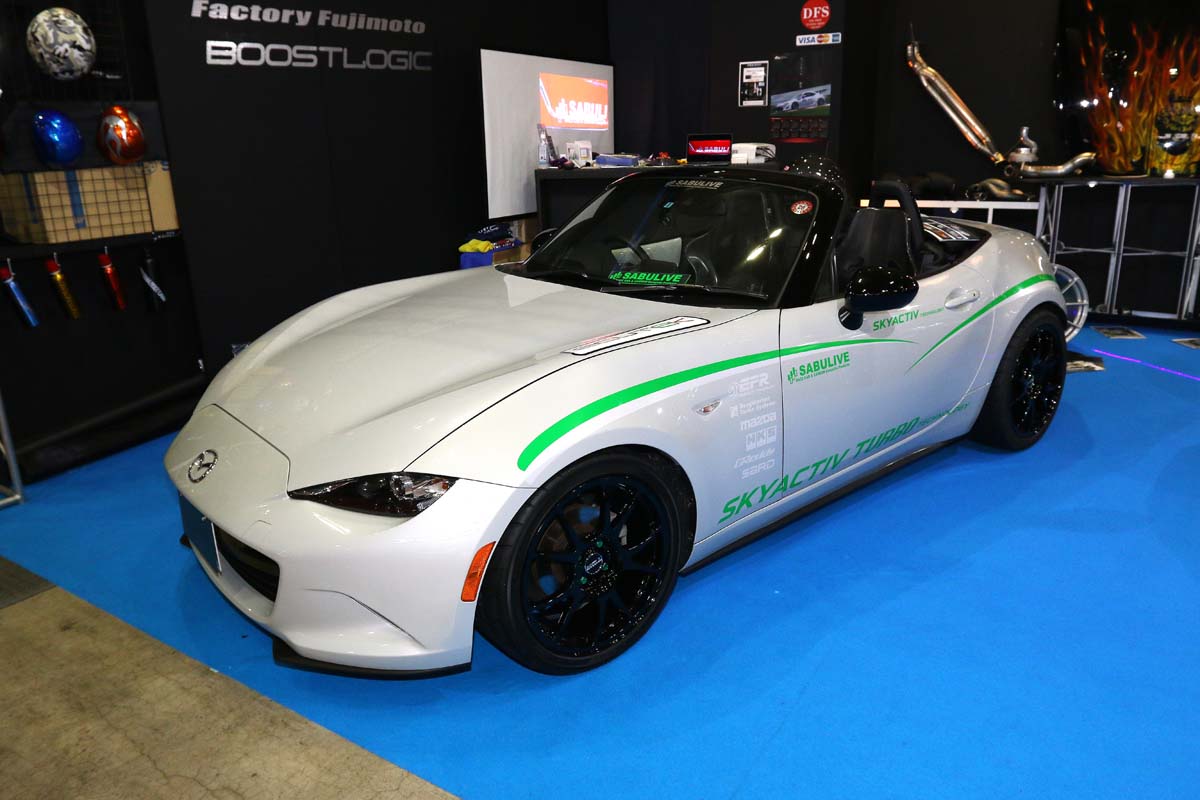 進入Sabulive官網就可看到,碳纖維的製作、鈦合金的焊燒、排氣芭蕉製作、增壓器的安裝及ECU的撰寫都是服務項目,基本上就是一家可依照車主意志打造車輛的實力派店家,社長佐分耕一也是時常在海外替更地改裝車進行ECU的設定,這輛MX-5也是今年展場內動力輸出最緊繃的一輛。原廠引擎搭上店家打死不肯透露的BorgWarner渦輪機型號,搭配自家全段排氣系統、碳纖維進氣管路,及EcuTek的撰寫下,目前1.0bar條件下可輸出200ps的最大出力,也是當天所有MX-5中動力最誇張的霸主,另外兩張碳纖維賽車椅也展現了Sabulive製造碳纖維的能力。