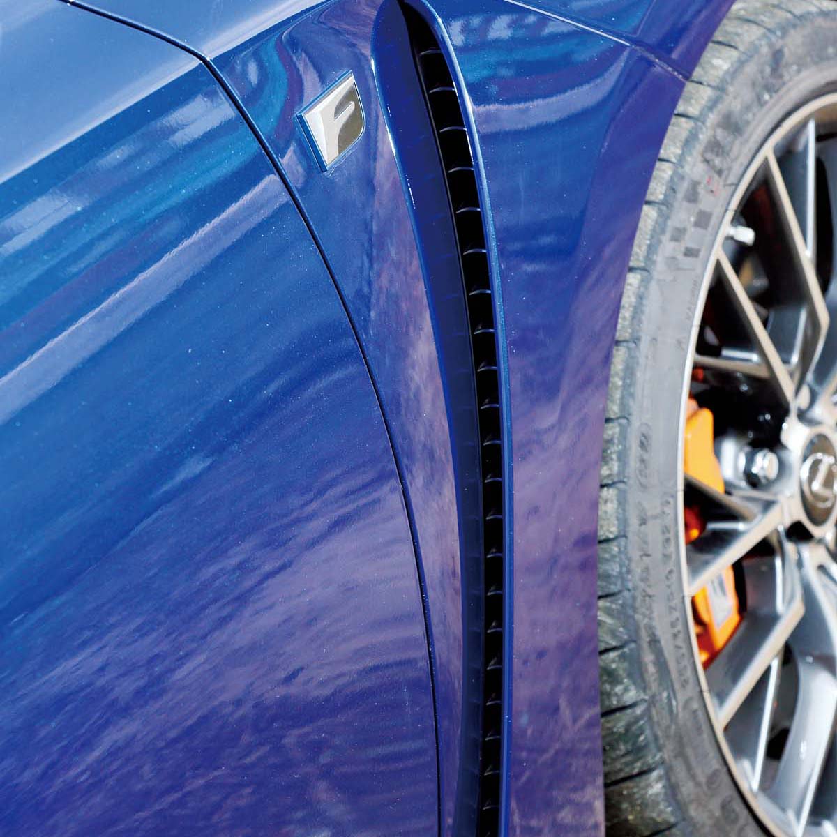 雖然一般標準版的GS已經擁有相當濃厚的運動氣息,但高性能版GS F的扮相則更加的賁張,在家族新世代設計語彙下,擁有霸氣寬大的紡錘型網狀水箱護罩與進氣壩,光此就展現出十足懾人的磅礡氣勢,尤其在保桿兩側、極具肌肉感的網狀式進氣口襯飾下,讓車頭更加流露出強烈的競技氛圍。車側部分,在專屬空力套件與降低車身的設計下,搭配前葉子板後方的L-shaped引擎散熱鰭孔以及19吋鍛造槍灰色鋁圈與大尺寸煞車碟盤和橘色卡鉗,完全彰顯出這部F系列跑房的強悍硬派風格,即便靜靜停滯,依舊展現不怒而威的氣勢。在車尾除了以GS F銘板來昭告其不凡的性能身份外,透過碳纖維材質的鴨尾擾流翼、燻黑LED尾燈組、下分流器以及左右四出排氣尾管等設計,將不容挑釁的性能氣勢提昇至最高點,來呼應引擎蓋下的那具擁有強大動力的V8引擎。