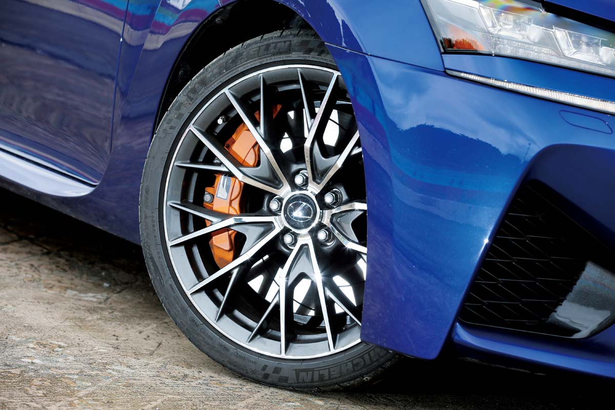 為了達到充分滿足駕駛者在操控上的信心與樂趣等訴求,設計團隊對於GS F的底盤與懸吊系統可說多加著墨,除強化車身結構剛性並增設前後拉桿支架外,運動化的硬朗懸吊也重新優化調校,同時搭配前255/35R19、後275/35 R19尺寸的Michelin Pilot Super Sport性能跑胎以及前380mm、後345mm劃線通風碟與Brembo前6、後4對向活塞卡鉗,來對應這部高性能跑房的身份。