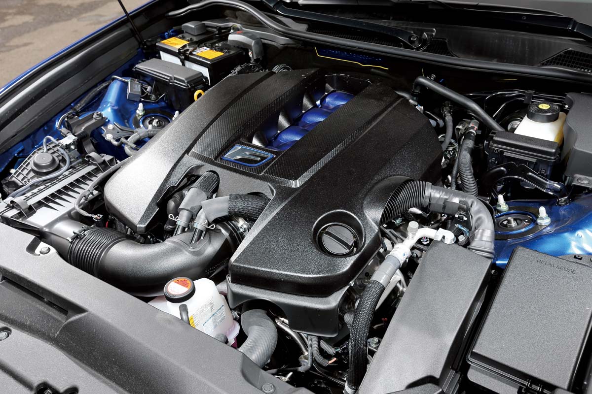 GS F搭載著一具與RC F相同代號2UR-GSE的5.0升V8自然進氣引擎,這具引擎儘管是以IS F引擎本體為基礎,但幾乎所有零件皆經重新打造,同時採用剛性更強的鍛造曲軸以及鈦合金進排氣閥門設計,並且透過D4-S缸內直噴與VVT-iE電動連續可變氣門等引擎技術,將最大馬力及扭力輸出提昇至477.3匹、54.0kgm,搭配8速SPDS手自排變速箱,0~100km/h加速僅需4.5秒,這般的動力數據與BMW M4、C63 AMG等競爭對手們相較亦不遑多讓。此外,這具引擎乃運用了Atkinson循環科技,因此引擎在低負載情況下可降低燃油的消耗,使其達到約為4.2升引擎的油耗水準,這也是GS F仍擁有平均油耗8.4km/L的主要因素,這在高性能跑車上可說表現相當出色。