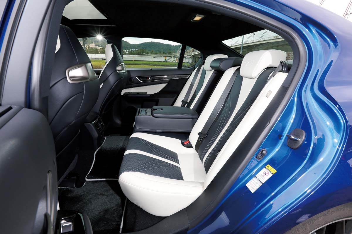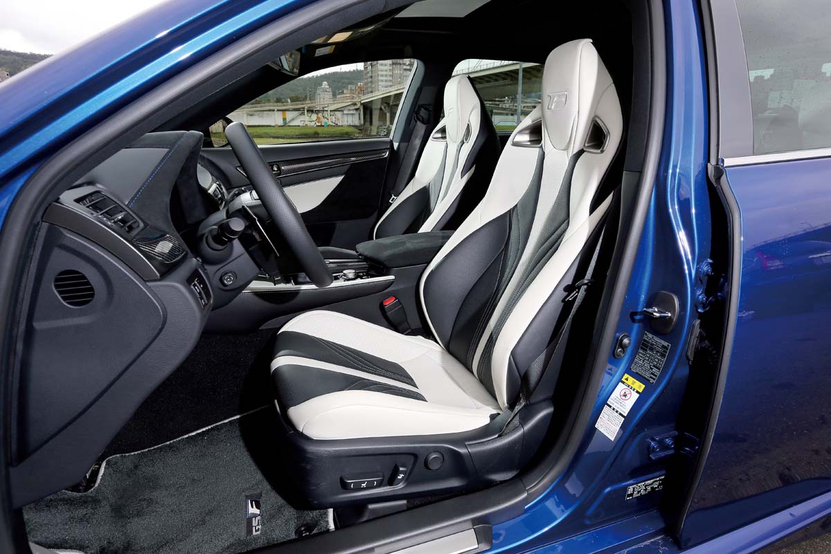 GS F的車艙鋪陳可說既豪華又具性能運動風格,從儀錶板上方、控檯兩側及車門內側與中央扶手等處均以Alcantara麂皮包覆,以及隨處可見的鍍鉻飾板來看,即能感受到原廠依舊想要讓GS F有著精緻豪華的內裝鋪陳;而在此基礎下則再導入了各項F專屬式樣的配備,來強化車艙內的性能味與運動感,包括碳纖維飾板、三幅式運動方向盤、環型數位賽車儀錶板以及造型誇張、並擁有強烈視覺效果同時也具備優異包覆性與支撐性表現的雙前座桶型賽車式座椅等,完全表達出GS F的性能定位與訴求。