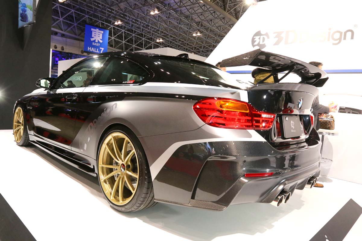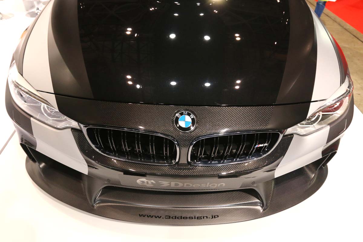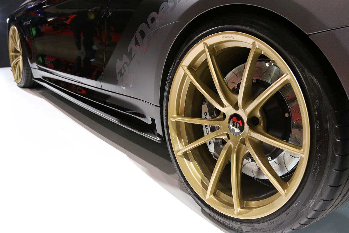 對於人人稱羨的M power車款,往往都是當代高性能的代表作,但是在各家改裝廠眼裡這可是強打自家品牌最好的試煉場,因此3D Design也在今年展出BMW F82 M4的CFRP空力套件,首先前保桿在造型上改良原廠式樣,因此除了進氣面積有效增加,可以看到往前延伸的下擾流,不僅有助於車頭氣流穩定,加上部分碳纖維紋路重新包覆車頭後,猛一看是不是就像碳纖維製品,車側方面,除了加裝碳纖維車身側裙與後視鏡,因應10周年慶所開發的Anniversary 01輪圈式樣特別交由BBS代工,前9.5J後10.5J的20吋鍛造品更適合M3或M4使用。