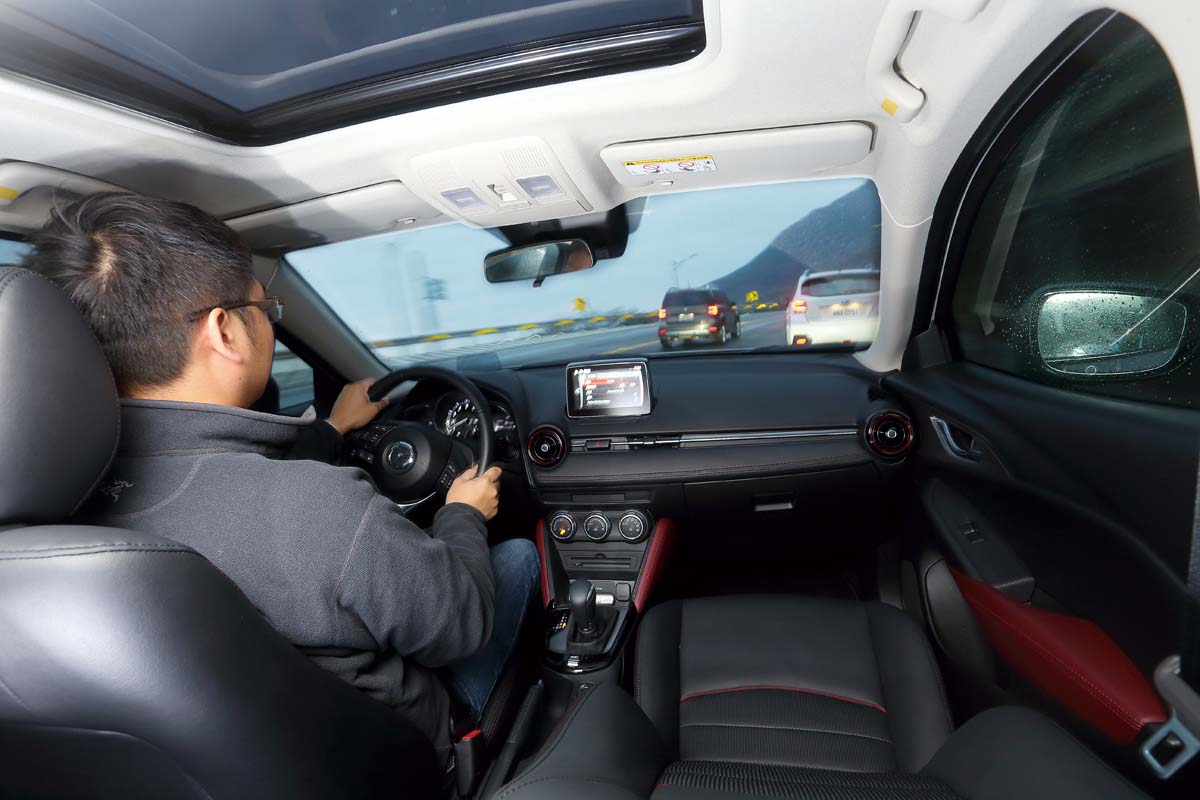 主角CX-3的動力操控表現或許可說是這些小型跨界車的好典型,上車坐進駕駛座並不會特別注意到它的車身尺碼,它的駕駛座高度跟駕駛介面的安排非常的房車化,駕駛感是這幾部車裡最像是房車的一部,但這並不代表CX-3已經穩操勝算,還是得上路跑跑才能論斷。Mazda原本就把CX-3設定為On-Road型車款,因此它對於道路駕駛的適應性極佳,在這次集評的幾部車當中,它是最接近房車的一款,轉向時的手感適中,車身的動態反應亦是十分靈巧,雖然沒有火辣激情的演出,但整體上仍有著相當高的成熟度。至於在動力方面,此次試駕的CX-3擁有156hp/20.3kgm的最大動力,雖然數據看來並不特別強悍,但卻帶來了輕快俐落的加速感,如果把車輛切換至Sport模式,變速箱的檔位選擇與動力特性會變得較為熱血,但這時也會突顯出CX-3意外的缺點,引擎在中高轉速域時不僅噪音較大,震動也較為明顯。