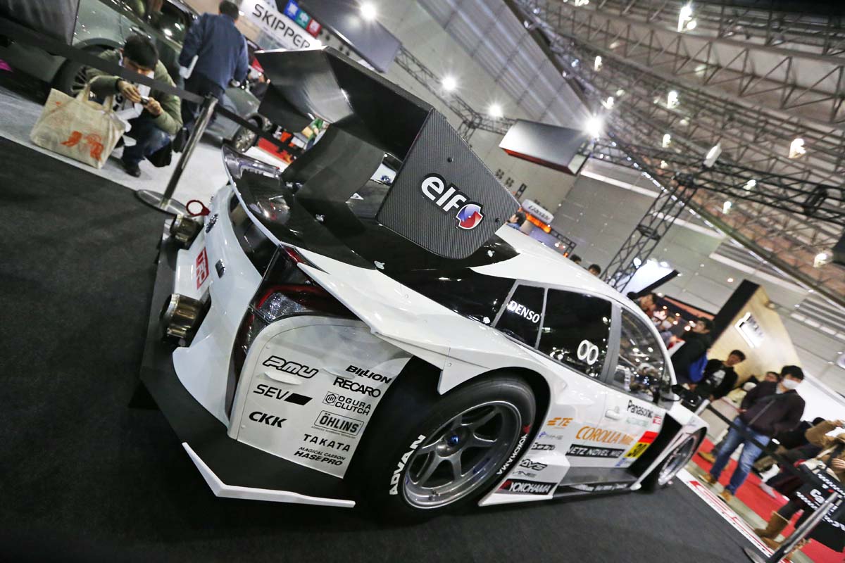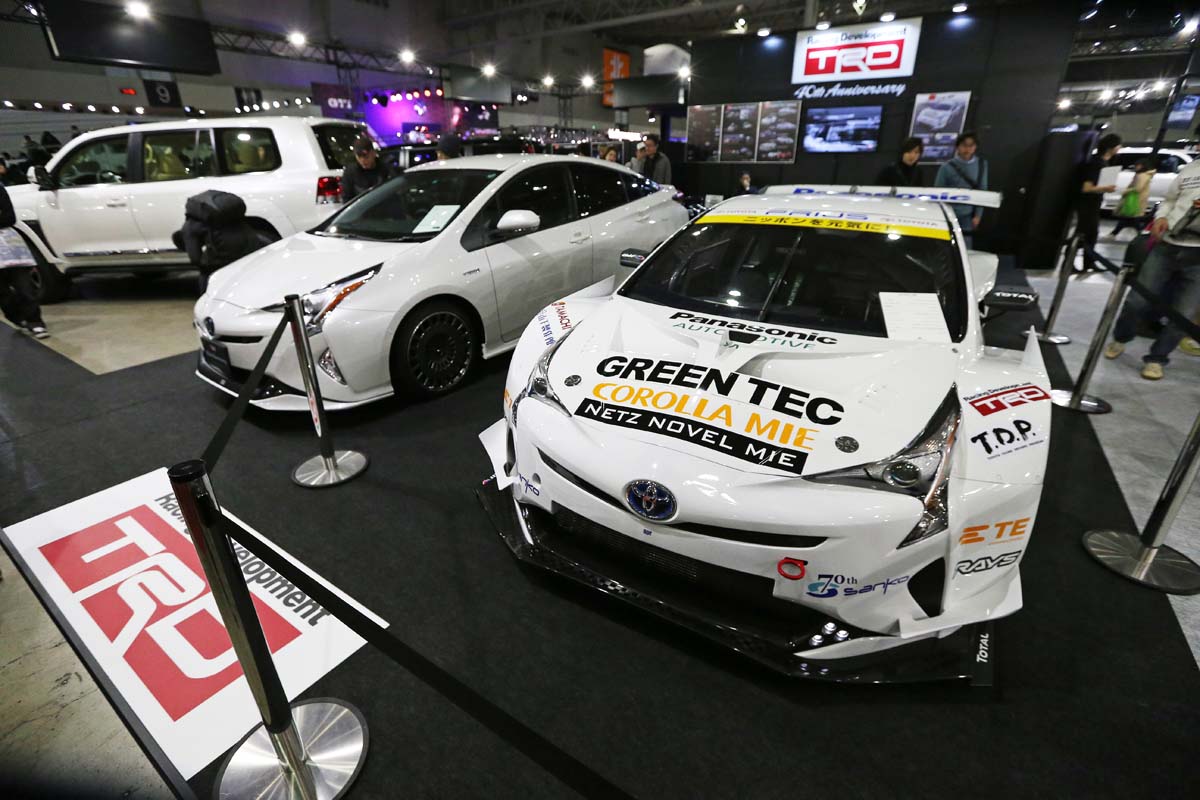 其中TRD攤位內就展出了多部Prius改裝車或比賽車,像照片中這部TRD推出的Prius Super GT賽車,雖然名義上是以Prius參賽,但為了符合所屬的GT300組別規範,以及競賽所需具備的一切戰力,這部Prius賽車其實只有外殼與市售車相似,包括引擎、底盤系統與車體結構等皆為比賽而特別打造,與市售車沒有多大的關聯性,這樣的手法在全球各地的房車賽事中都可見到。