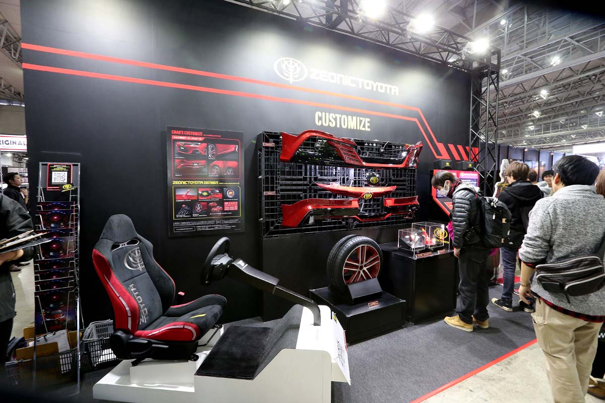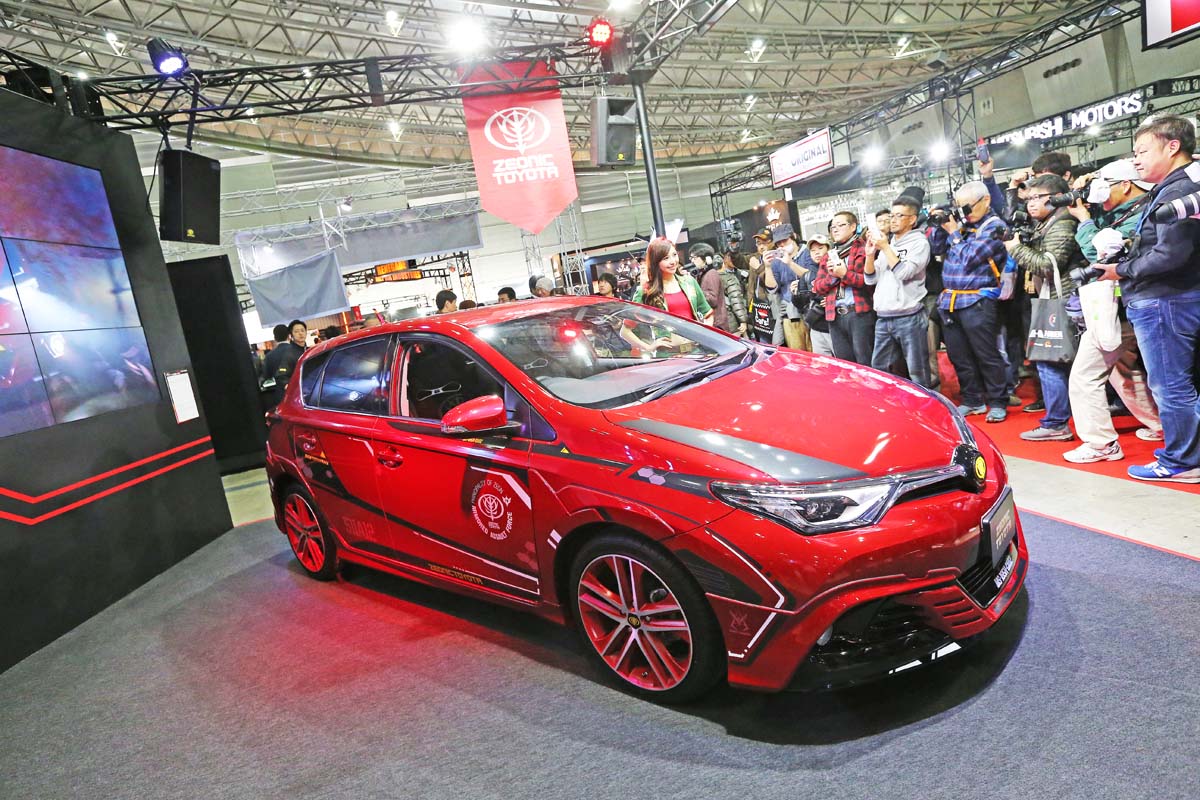 | 這部夏亞式樣的Auris,不僅全車採用夏亞大佐專屬的紅色塗裝,車頂天線也改成薩克隊長機的通訊天線角,完全實現所謂的「紅色、有角、三倍速」理念,現場還陳列的全套改裝部品,讓喜愛剛彈的玩家大開眼界。 |