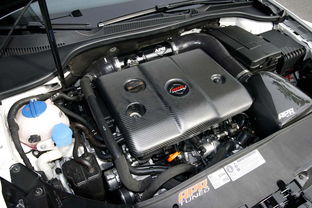 而優異的引擎體質也讓Golf R VI首度捨棄傳統V6自然進氣改為2.0升渦輪增壓引擎,不過這具引擎內部機件如活塞、曲軸、噴油嘴、高壓噴油泵浦等周邊都有進行強化,渦輪機則是從GTI的K03換成與S3相同的K04,並加大進氣冷卻器,最後增壓值再提升至1.2bar的水準,一舉將動力提高到270hp/35.71kgm的水準。不過為了打造出性能更為強悍的Golf R,APR透過Stage 3.套件,包含GT 2871渦輪、R專用Downpipe、加厚進氣冷卻器,高壓泵浦、加大噴油嘴、鑄造渦輪頭段、專用進氣系統、周邊管路等,搭配ECU程式讓最大馬力達到400hp。