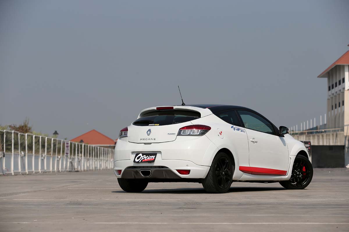 雖然每個人對於車輛外觀設計風格的喜好不盡相同,但是採用純正法國設計的Renault Megane III RS250 Cup,在車身充滿肌肉線條的勾勒下,輕易營造出小鋼砲所需的跑格,事實上受惠於Renault投入F1賽事的寶貴經驗,許多頂尖科技的精隨其實都能夠在車身外觀中發現,例如車頭為了達到最佳風阻係數,同時又要兼顧冷卻與下壓力效能,因此車頭除了中間氣壩,其餘並未額外開孔增加散熱效能,可見得Renault對於引擎的溫度控制相當有自信,另外以紅色所裝扮的大V型擾流其實也是沿用F1前鼻翼原理所設計,直接融入於前保桿有助於穩定車頭氣流。而前後葉子板所採用的小寬體式樣,配合車門下緣明顯較側裙凸出,除了有助於車側線條更加豐富,當車輛高速行駛時有助於車身穩定性,不過雖然空力外觀看似完美,但是過於圓滑的車尾怎麼看始終就是缺少點性能味,為了讓車尾造型更具殺氣,同時增加下壓力,目前車主透過比對各式尾翼已著手朝自行開發套件邁進。