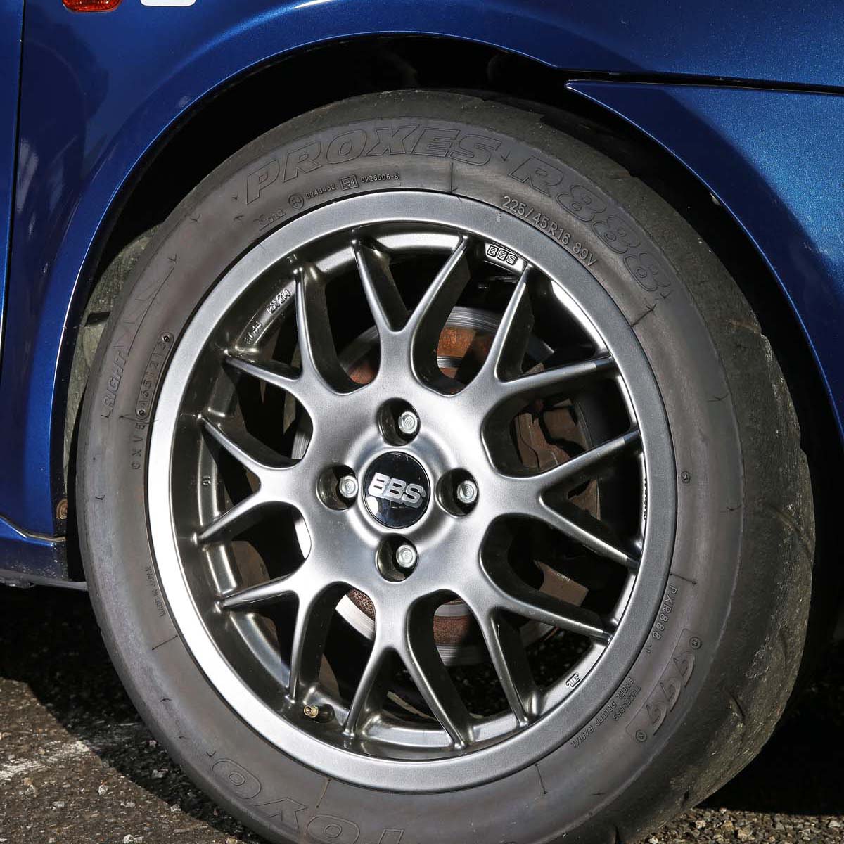 | 完全走向競技化的操控設定,除了輪圈換上16吋BBS輕量化部品,屬於熱熔胎等級的R888則是隨時背上車。 |
