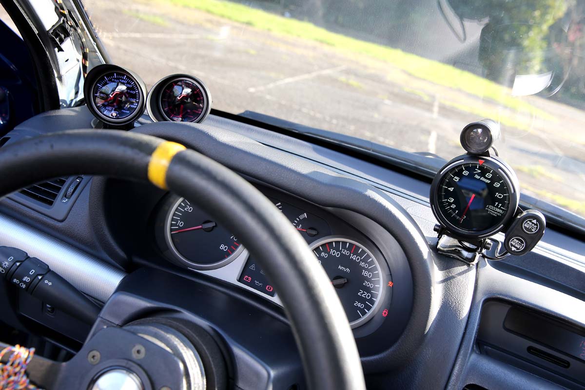 不過除了底盤需要強化之外,過於激烈操駕時更是需要良好的操作介面,因此一張功夫龍桶椅配上四點式安全帶有效將駕駛牢牢綁在座位上,而為了有利於駕駛隨時掌握引擎狀態,透過額外追加的油溫、油壓與引擎轉速表以避免一時疏忽而造成引擎內部損傷。另外激烈操駕難免會增加意外發生的可能性,為了增加車體剛性與安全性,因此後半部所加裝的半套防滾籠,一方面可補強車尾變形率,就算車輛失控也能確保駕駛的人身安全。