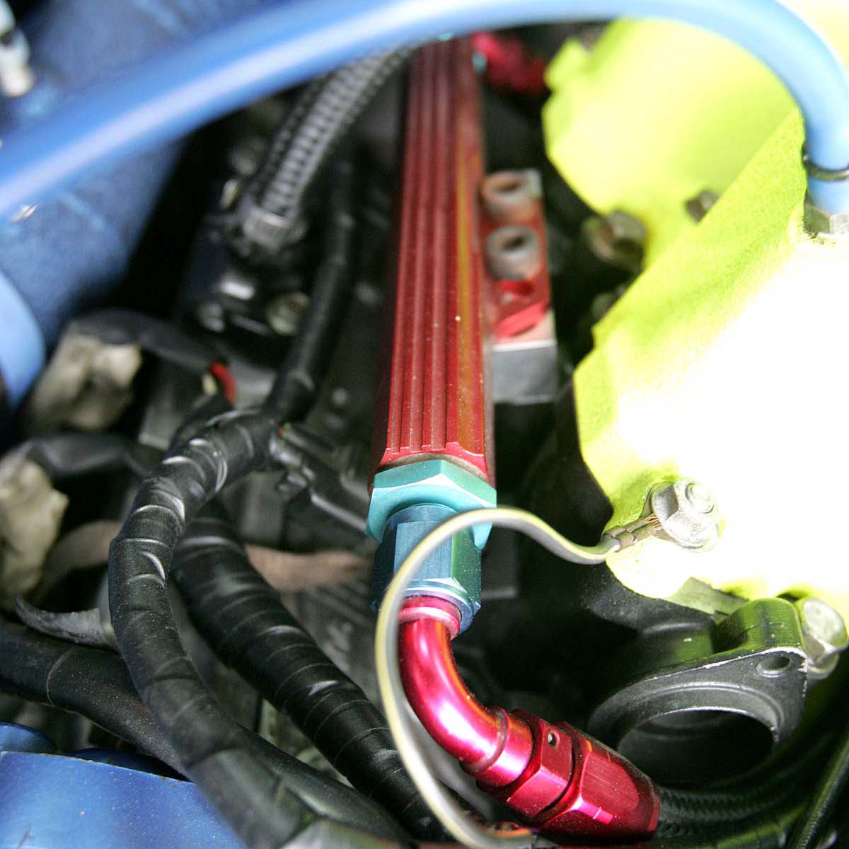 | EJ引擎的汽油道設計其實有點奇怪,如果原廠不改都會有四缸噴油壓力不均的問題,因此大改車輛會將油道改良為獨立系統,並且換上更大的油軌讓噴油嘴得以均勻的噴射。 |