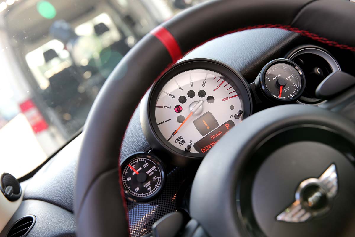 | R56車主在轉速表兩旁加裝了增壓表及水溫表來控管引擎狀況,目前進排氣及電腦小幅提升的設定下,表示一般道路上已經是相當夠用。 |