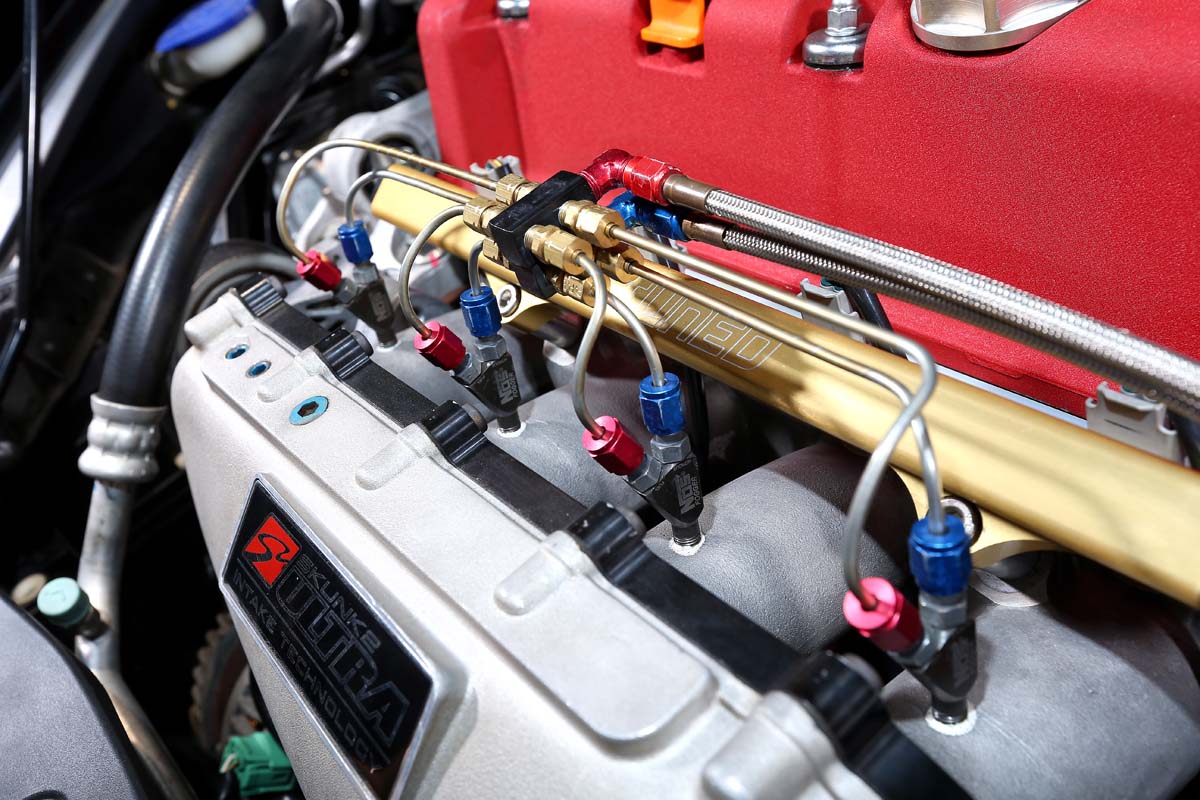 NOS部分採用與汽油共同注入的濕式設計,與常見的將噴嘴裝在節氣門前端不同,這輛FN2的做法更加一拜,在Skunk2歧管上分別開了4個空位來安裝噴嘴,採用每單缸單獨注入的設定來大幅提升性能,並且噴頭部分再加以施工,推測NOS輔助能力已有將近80hp之譜。