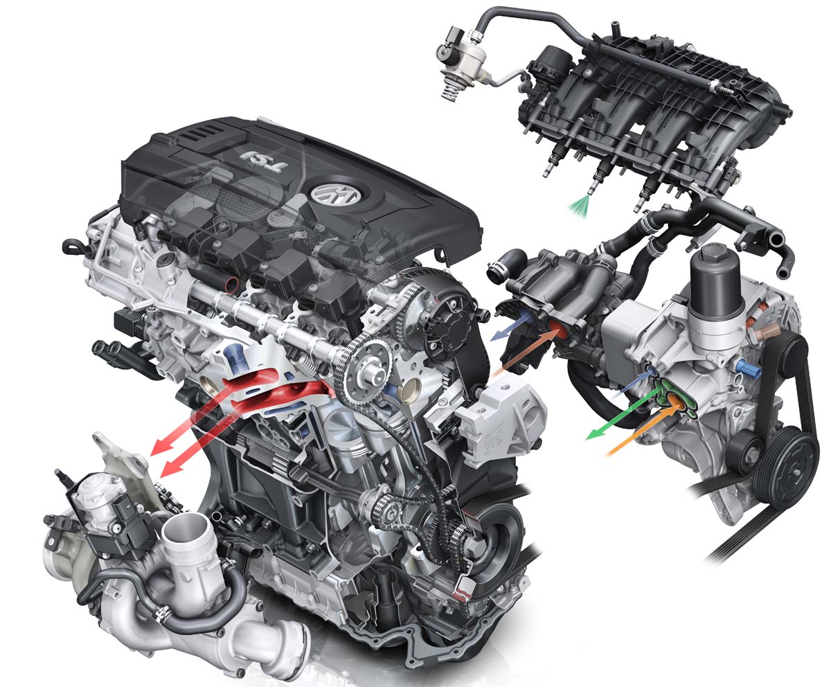 雖然Golf GTI 7搭載的引擎同樣是被稱做代號EA888的缸內直噴直列四缸引擎,不過整體設計早已跟舊款引擎大相逕庭,而所有的改變都是為了使這顆引擎能節省更多的燃油消耗與更敏捷的出力反應。而在所有設計中最引人注目的,莫過於採用FSI缸內直噴+MPI傳統進氣歧管多點噴射的「雙噴供油系統」,也是幫助第三代EA888引擎更為省油的利器。而為了滿足大幅提昇的輸出功率和全負荷下更優異的燃油效率,這顆引擎在進排氣門上也配置了可變氣門揚程與正時系統,透過雙可變的設計,使得引擎進排氣效率更為提昇許多,並可因應不同需求調整正確的汽門重疊時間,以同時兼顧馬力與扭力表現。