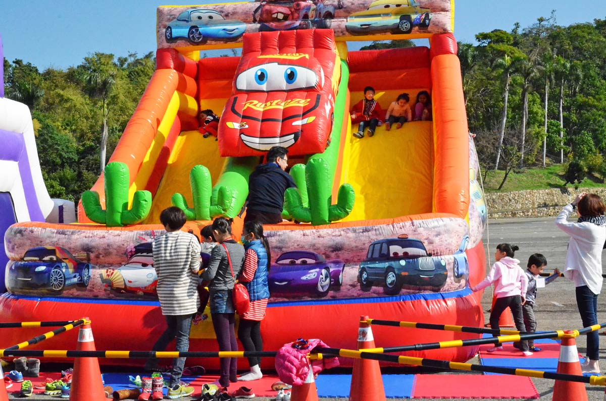 | 大人愛看車,小孩更愛玩「氣車」,兩頂大型氣墊床就讓現場小朋友玩到忘我,已經不太在乎爸爸參加什麼車聚了。 |