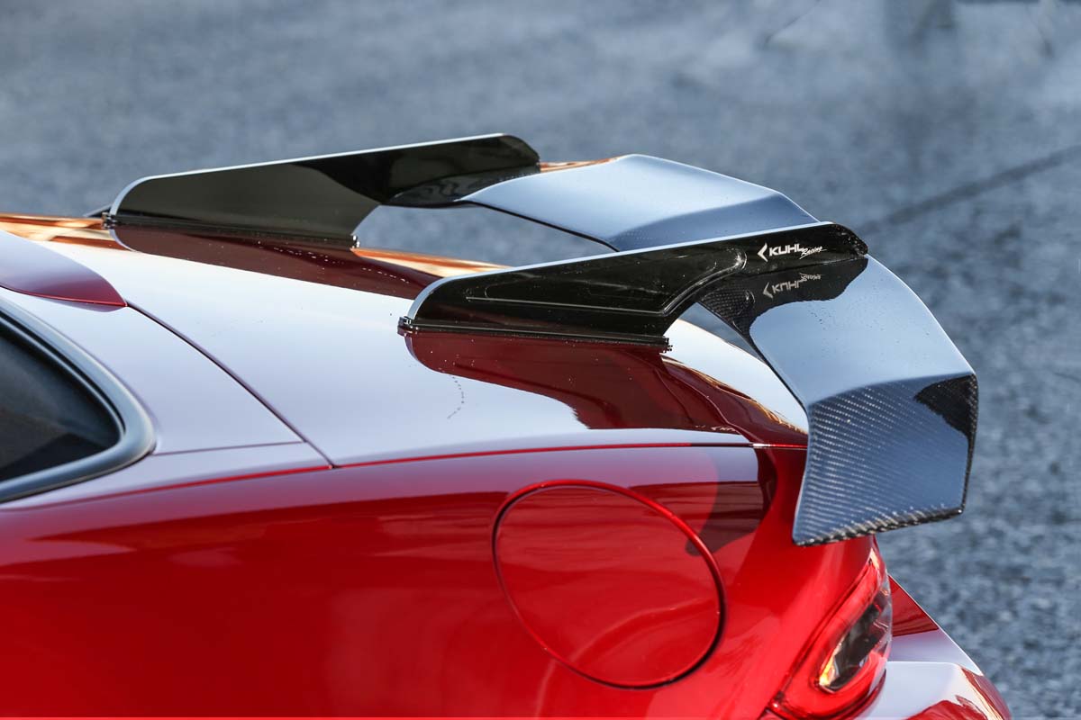 後保桿更是屌到破表,除了常見的左右兩側開孔外,這次完全比照Racing車輛打造的設計,刻意透過設計將後保桿在視覺上做向上提升的視覺效果,下半部開孔的設計及消光黑的塗裝令車尾更具侵略性,並且搭配上專用的誇張後下擾流,將排氣管出口改由中置雙出設計,純賽車的鬥氣完全釋放。最後Kuhl Racing自豪的3D曲面碳纖維尾翼,看似相當誇張的設計風格,但卻又充滿了保守氣息,搭配上相當誇張的下半部空力套件,有種視覺上的整合效果,不過分卻又讓人看過就難以忘懷的線條特徵,不得不說Kuhl Racing線條上的應用真的相當有一套。