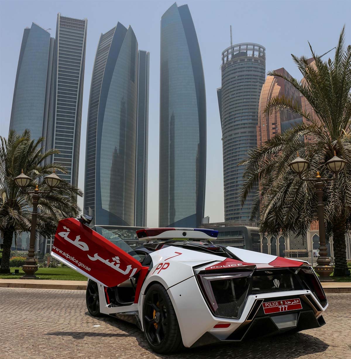 玩命關頭7(Fast & Furious 7)中,由馮迪索所飾演的唐老大(Dominic Toretto),駕駛一輛Lykan HyperSport飛出大樓的畫面,相信大家應該印象深刻,這輛由黎巴嫩W Motor所推出的超跑,在2013年杜拜國際車展中展出,要價340萬美元的車價,僅次於Lamborghini Veneno的450萬美元,與Maybach Exelero Concept的800萬美元,名列全球第三貴,全球限量生產7輛,身為中東國家生產的第一款超跑,Dubai當然要買一輛。搭載一具來自RUF的3.7L水平對臥雙渦輪增壓引擎,可榨出770hp最大馬力與98kgm最大扭力,2.8秒就可從靜止加速到100km/h,極速到達390km/h,於2015年6月成為Dubai新警力,為目前全球極速第二高的警車。