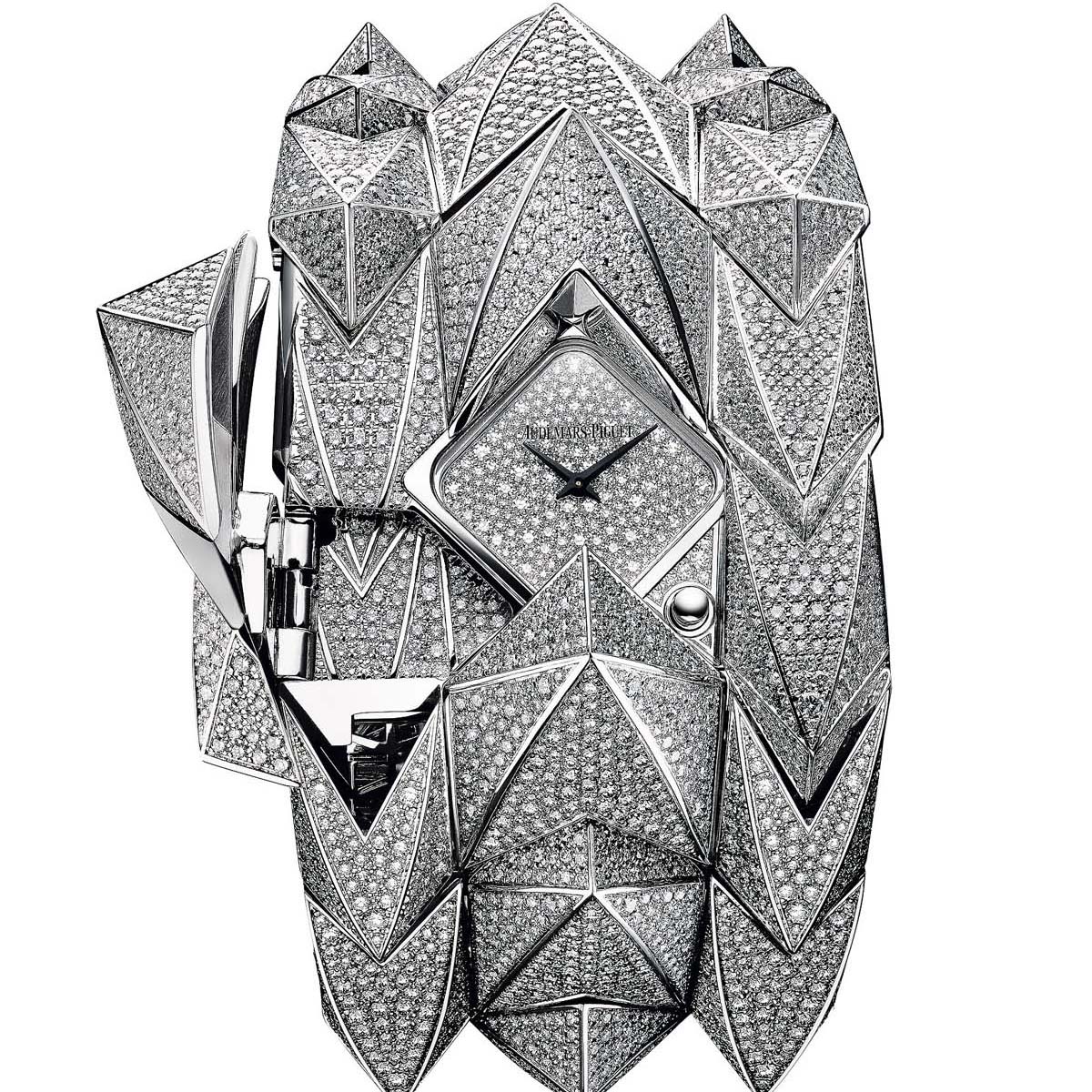 今年女性腕錶頭號紅牌則是愛彼(Audemars Piguet)拔得頭籌,去年發表Diamond Punk就引起市場高度注目,沒人可以想到女錶可以這麼有型。今年品牌再接再勵續發新作Diamond Fury,則是以強力的幾何線條做為腕錶身型。腕錶採用隱密式錶盤,當闔上錶蓋後,整支腕錶就像個引人注目的首飾,加上閃死人的全鑽鑲嵌,說她是今年女錶的話題焦點,一點也不為過。
