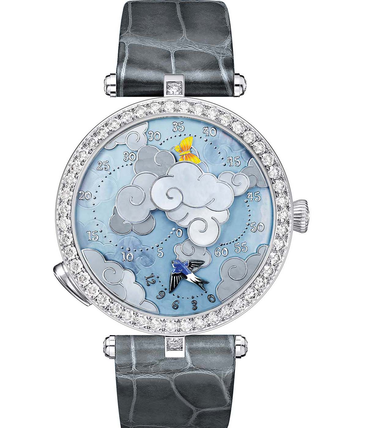 最會說童話故事的鐘錶世家梵克雅寶(Van Cleef & Arpels),這次選擇以大自然最美麗的生物:蝴蝶與燕子來訴說他們的鐘錶童話。為了呼應時間流逝的過程,腕錶也以三隻蝴蝶的飛進飛出顯示分鐘,做為時間不等人的巧妙隱喻。而底下的燕子翅膀則做為時標顯示,十分有趣。