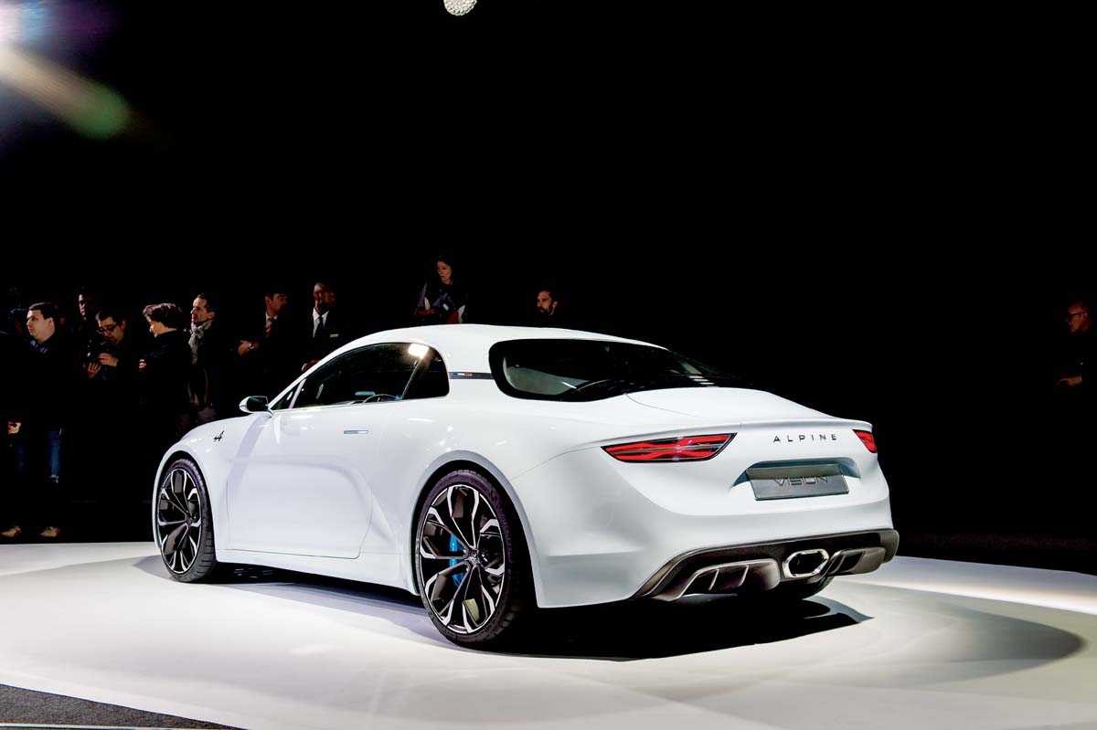 擔任Renault旗下性能賽車品牌Alpine復興重責大任的Vision Concept,選擇於2016年日內瓦車展現身,造型師法於2015年法國Le Mans大賽中發表的Celebration Concept,並將線條處理得更為成熟、更具量產雛型,Alpine也宣稱未來量產之後,會有著與概念車約80%的相似度。從外至內皆相當性能化的造型與鋪陳,Vision Concept也期望動力系統展現運動血統,不過並未透露細節規格,而僅表示搭載四缸渦輪增壓汽油引擎(推估有可能將採用源自Renault Clio RS身上的1.6L四缸渦輪增壓汽油引擎),以及雙離合器自手排變速箱,具備讓Vision Concept於4.5秒從靜止加速至100km/h的強悍實力,爾後正式量產之後,也將為車壇再添一名嗆辣小跑車。