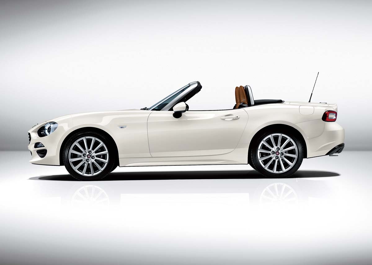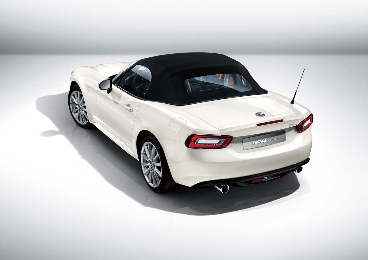 Fiat 124 spider是FCA與Mazda合作之下所共同開發的產品,其車輛結構本體是以MX-5平台並掛上Fiat廠徽所打造的車款,雖與MX-5為雙生車款,但在外觀及引擎皆能發現124 spider與MX-5差異之處。外觀方面,124 spider採用與MX-5截然不同的設計風格,寬大的水箱護造型、引擎蓋鮮明強烈的鈑件折線及上揚的車頭設計,營造出鮮明的樣貌且具有獨特歐系風味,車尾採用方形尾燈也同樣散發出義式風格,不過在車側身形則維持與MX-5相同的線條設計。