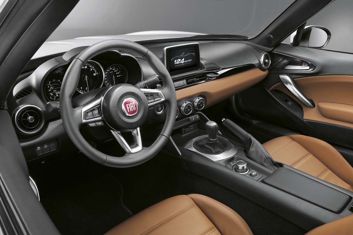 相較於外觀方面的差異,124 spider內裝並無特別進行任何修改及妝點設計,因此內裝整體有著與MX-5幾乎相同的造型,而在這基礎下124 spider可享有7吋觸控中控系統與多功能旋鈕所帶來的便利直覺操作感受,儘管內裝相當相似,但仍可發現些微差異。MX-5在門板上緣為與車色同色之設計,124 spider則是以一般飾板鋪陳,另外差異之處便是方向盤上的廠徽。配備方面,除多媒體系統及多功能旋鈕外,亦導入主動式LED頭燈、盲點監控、倒車盲點偵測警示、倒車顯影,整體陣容頗為豐富已足敷一般用車需求。至於動力部分,是124 spider與MX-5另一最大不同之處,有別於MX-5的1.5升或2.0升Skyactiv引擎,124 spider搭載一具1.4升渦輪增壓引擎,在渦輪加持下有著160hp/25.4kgm最大輸出動力,更為出色的扭力輸出峰值與輕量化車體設計搭配後輪驅動系統,則帶來更具樂趣的操駕感受,變速箱部份也提供六速手自排與六速手排供選擇。