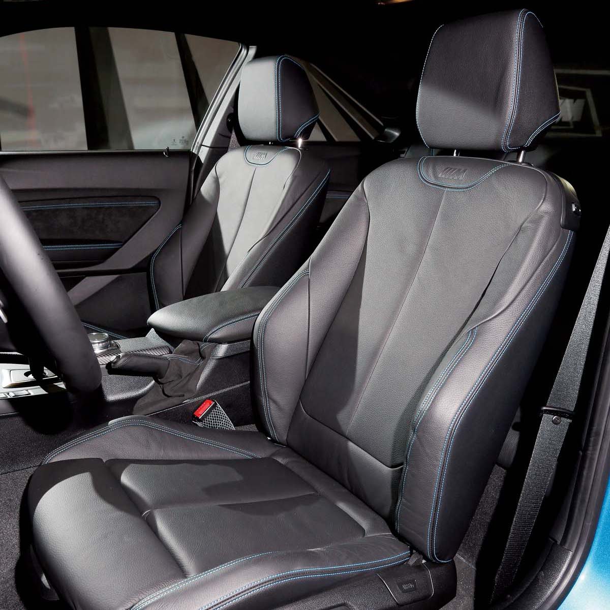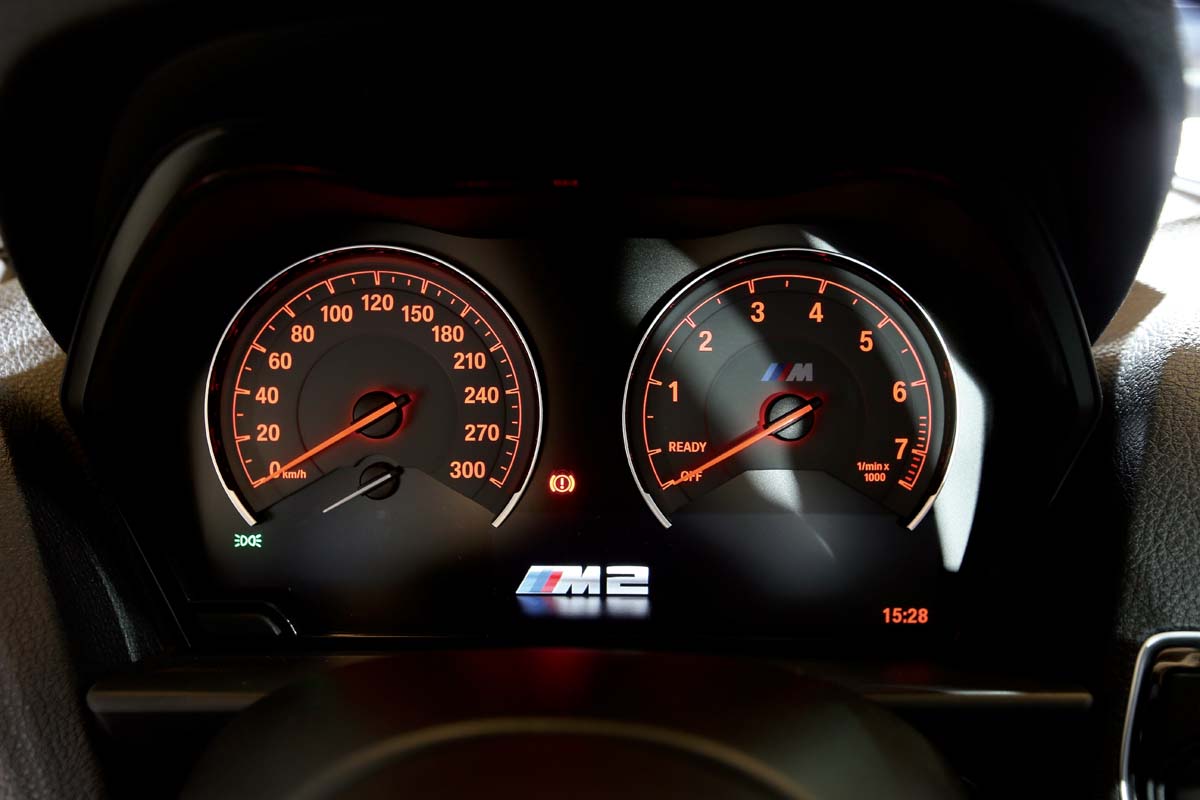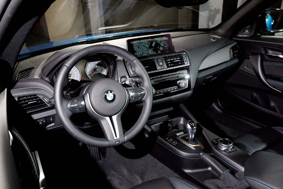 車艙內部的設計採用真皮與碳纖維飾板組合而成,駕駛者導向的操作介面帶來了非常濃厚的運動感,而在儀錶板、門檻飾板、排檔頭以及方向盤等部位,都是採用M款專用組件,各項操作介面都依據BMW的傳統採用了直覺且容易使用的設計。至於在其他配備部分,M2也為駕駛者與乘客準備了十分豐富的項目,包括雙前座電動調整賽車椅、60 / 40分離傾倒座椅、黑色頂篷、8.8吋iDrive螢幕、原廠中文衛星導航、iDrive手寫觸控面板、Harman / Kardon高傳真音響系統、藍牙免持行動電話系統、Comfort Access免鑰匙系統,提供駕乘者愉悅的旅程感受。另一項有趣的配備則得跟手機配合才成,iPhone的使用者可透過iOS App商店下載名為BMW M Laptimer的應用程式,此一程式不僅可以為車主進行單圈成績紀錄,並且會從車上的感應器取得相關的數據資料,協助駕駛者分析操駕方式以追求更快的賽道成績。