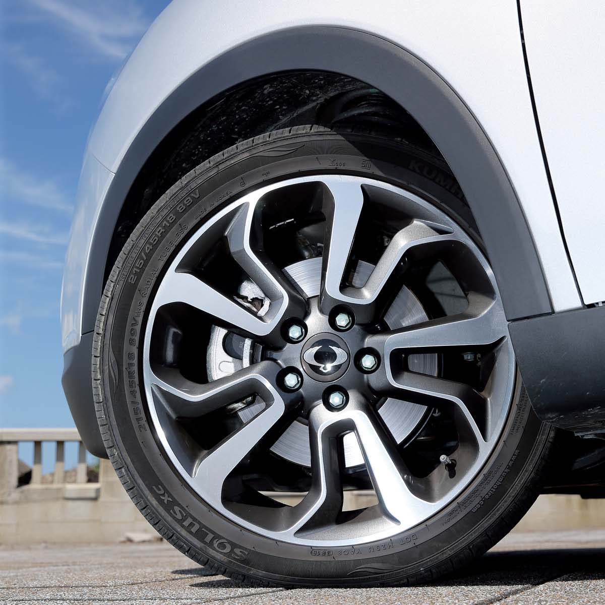 車側則是Tivoli讓人印象最深刻的部分。透過前輪拱與後輪拱誇張的鈑件折線,營造出肌肉感十足的視覺感受;據原廠表示,這兩道肌肉線條將會是未來SsangYong旗下產品的家族設計。黑色防刮飾板除了增添戶外風情,在跨越非鋪裝地形時也能防範烤漆被刮傷;鋼琴亮面烤漆的A柱、車門框頂部延伸至C柱上的烤漆點綴,帶來懸浮式車頂的感受。而頂級豪華車型搭配的18吋鋁圈,採雙色鑽石切割設計,讓輪拱之下不致過於空洞。唯一可惜之處在於車頂未裝上行李架,若有機會補上,相信能更具個性化戶外氛圍。