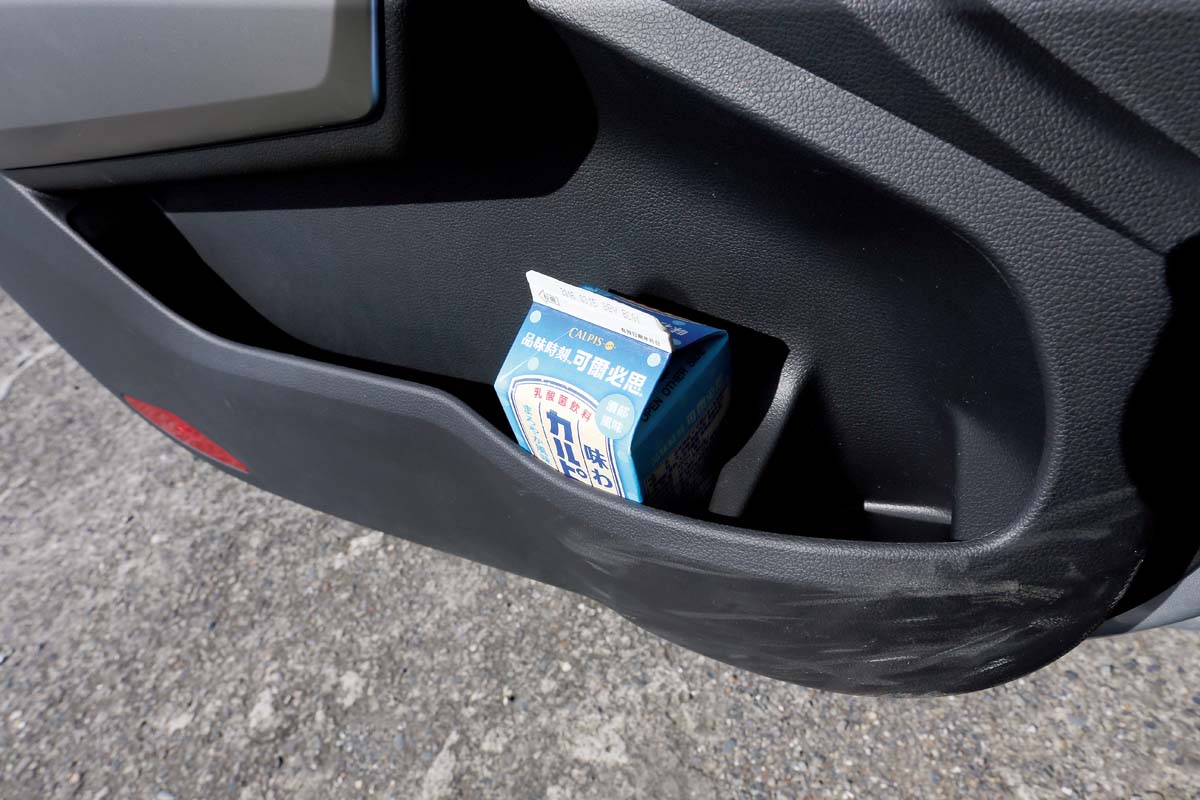 | 前座車門有兩個杯架,其中一個勉強可放下方型包裝的飲料,車門開啟後還有後方警示燈。 |