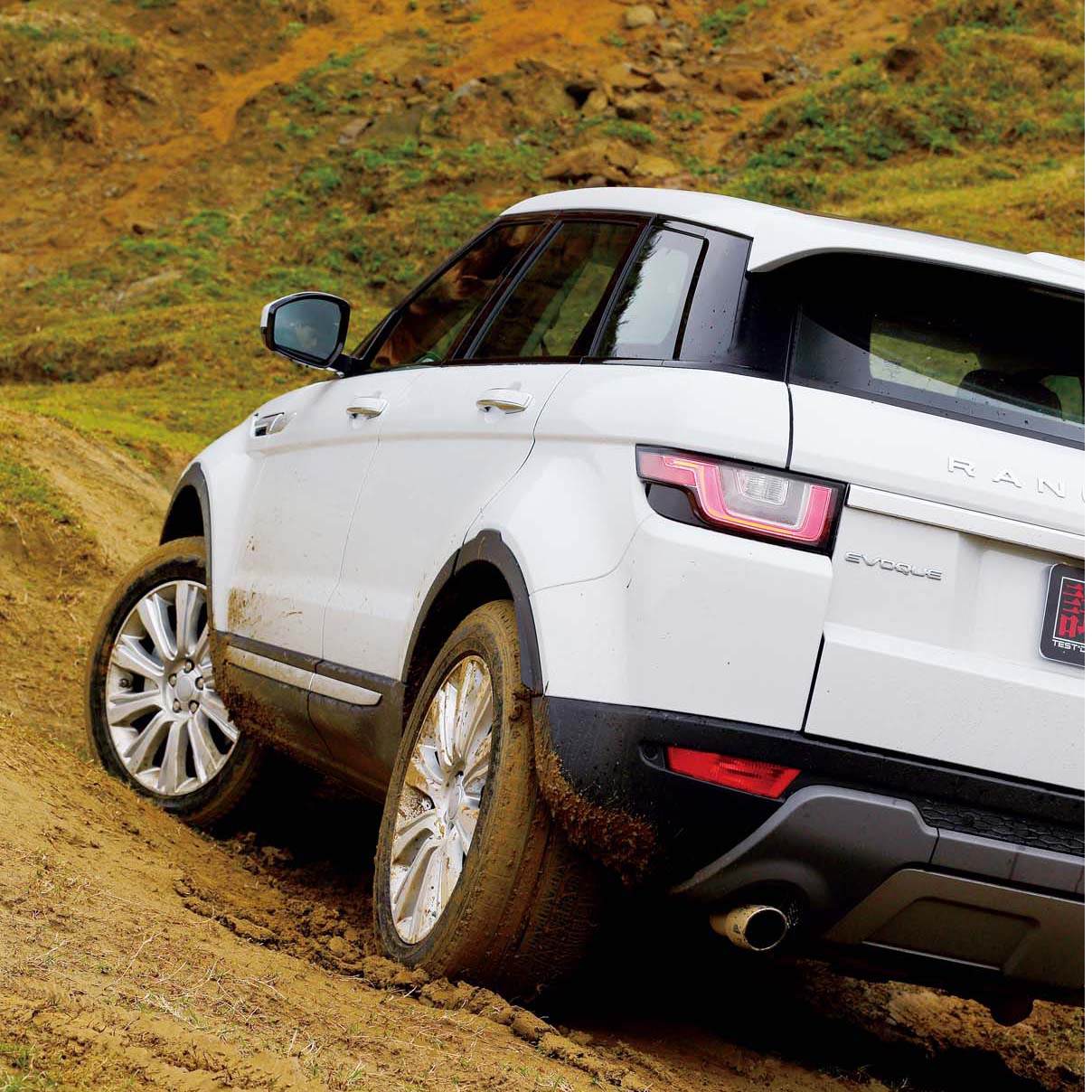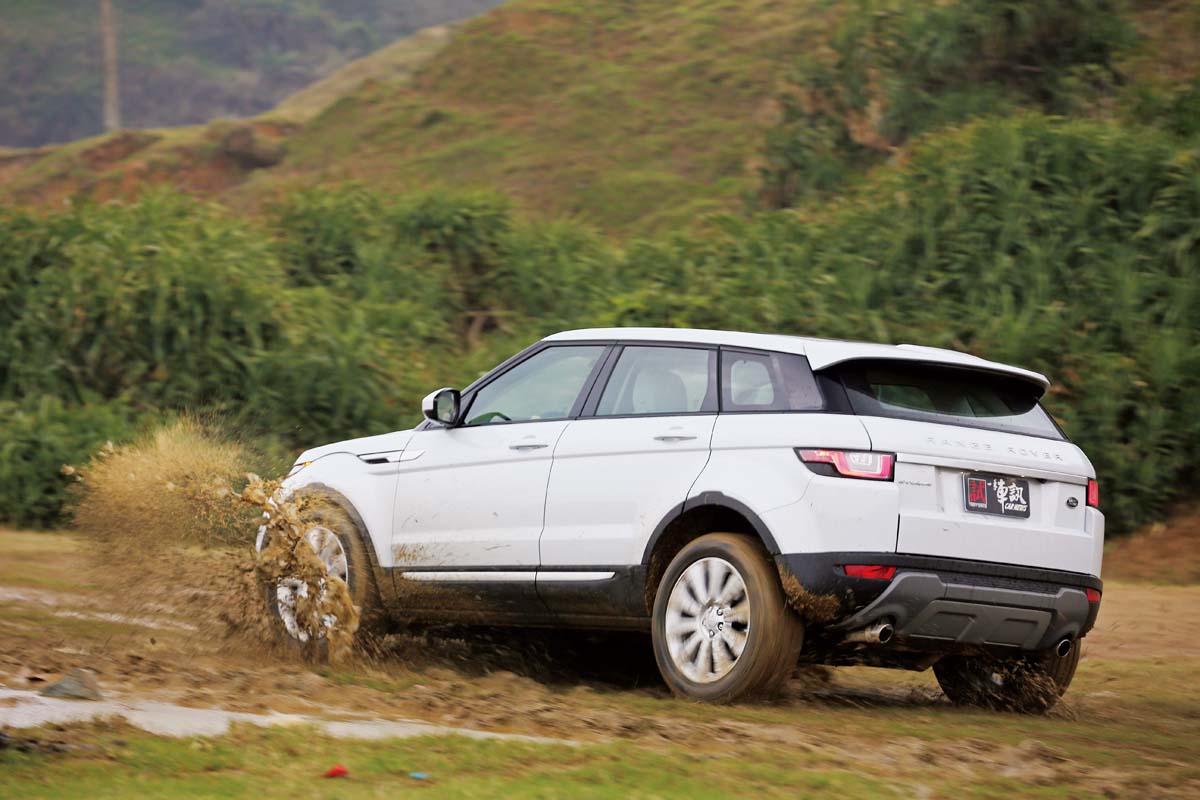 在車身設定方面,Range Rover Evoque擁有進入角25°/離去角33°/跨越角22°、涉水深度500mm等先天條件,另外亦有配置可針對不同路面進行調整的道路、草地、泥濘地、沙地等地形模式。恰巧試駕當天一直處於下雨狀況,對於試車拍照工作來說是不理想的環境,但卻是測試體驗Range Rover Evoque越野能力的最佳時機;由於下雨關係平日偏硬的泥巴地變得相當鬆軟,這樣路況相信多數僅配置四輪驅動的車款是無法通行的,不過Range Rover Evoque在切換至泥濘地模式後,系統便會依照抓地力來調整驅動方式以防止輪胎打滑,在地形系統輔助下只需控制方向盤與油門,便能享受在泥濘地穿梭與車輛隨著地形上下起伏所帶來的快感,若是改換成越野專用輪胎相信表現會更加出色。