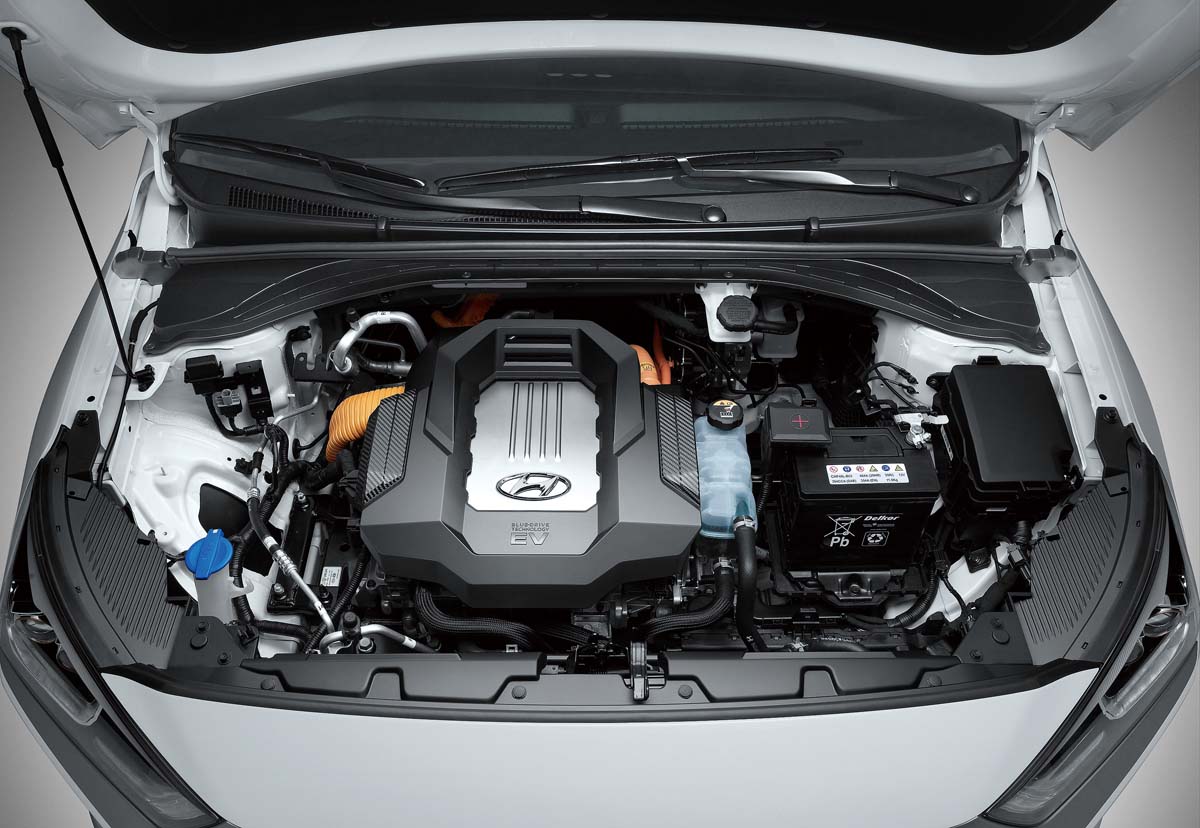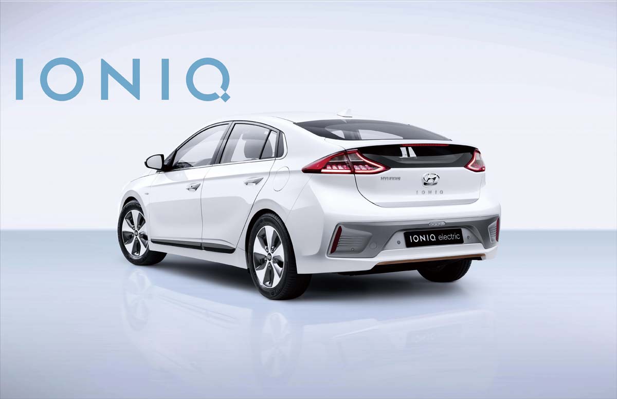 Ioniq的Electric純電動車部分換上120ps最大馬力的電動馬達搭配28kWh鋰電池,續航力可達250km以外,極速為165km/h,並提供ECO、Normal、Sport三種輸出模式。利用名為ICCB(In-Cable Control Box)充電系統加以充電,以100kWh規格可以在24分鐘內充到80%電量,至於碳排放,當然就是完全為零。