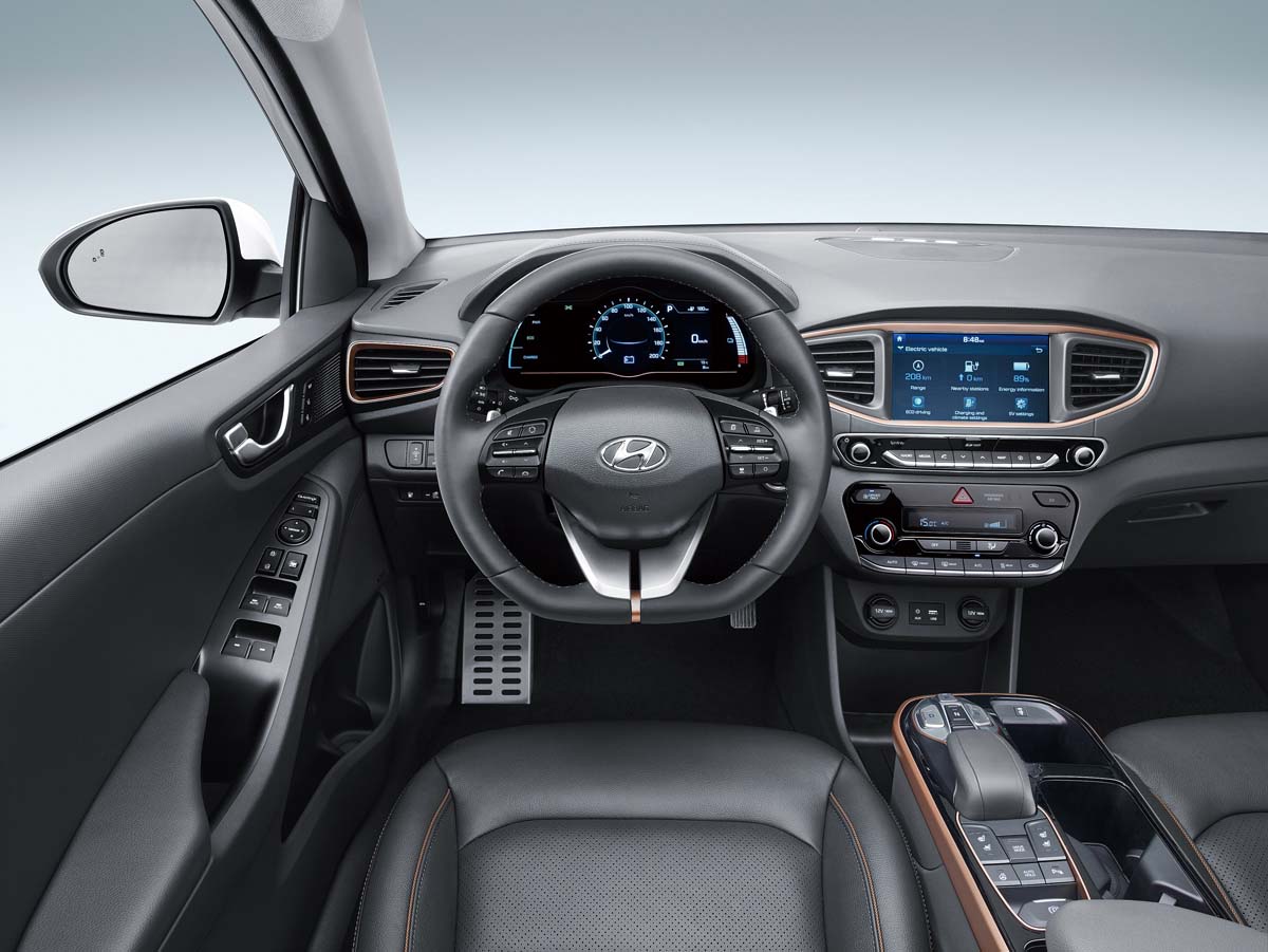 相對於Prius的前衛氛圍,Ioniq則與當前Hyundai品牌設計高度連結,傳統的駕駛前方儀錶板、控檯中央以大型螢幕呈現的車載資訊平台,此平台並導入Apple CarPlay與Android Auto車用作業系統。下方則為資訊平台控制鈕、空調等控制介面等,其中Hybrid油電複合動力與Plug-in Hybrid插電式油電複合動力車型採用傳統排檔桿設計,位於中央鞍座處,而Electric純電動車則以按鍵式設計取代傳統排檔功能。特別的是,為區別三種不同動力設定,座艙配色方面Hybrid油電複合動力車型以黑色為底搭配藍色線條點綴,Plug-in Hybrid插電式油電複合動力車型則採用淺色系設計,Electric純電動車則以黑色底搭配金銅色裝飾,呈現三種不同的風格。