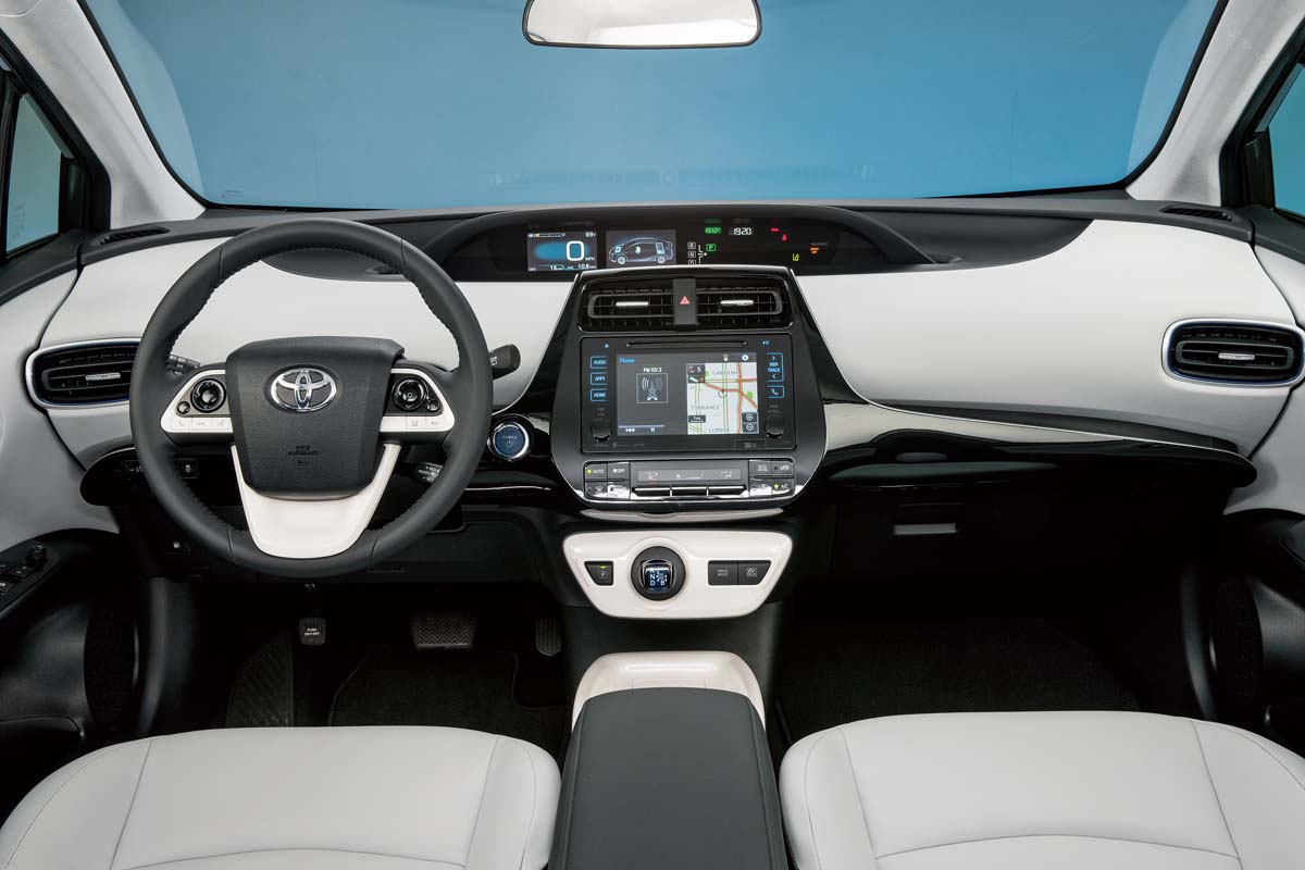 Prius座艙設計貫徹過去資訊儀錶中置式設計邏輯,取代傳統儀錶功能的MID多功能資訊顯示幕置於控檯最上方,並可依照不同行駛模式轉換資訊呈現介面。以和泰汽車引進台灣所銷售的規格中,控檯中央更導入整合衛星導航系統的7吋觸控式影音主機。為讓駕駛可更專注於前方路況,也針對駕駛前方配置HUD抬頭顯示器,提供如時速錶、油電系統作用指示圖、主動式行車安全系統顯示等功能。以雙層式資訊顯示幕為主軸,Prius的中控檯採取懸浮式設計,飾板如飛翼般往兩側展開,下方接著的是排檔座,刻意空出的中央鞍座部分以大型置物處與置杯架取代,營造更為寬敞的前排乘坐空間感受。