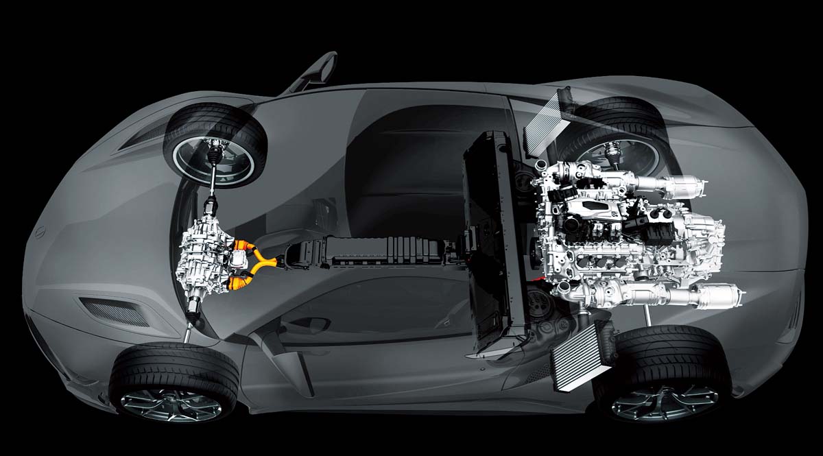 | NSX的電動馬達位於後軸(一具)與前軸(兩具)之上,與後軸輸出的內燃機動共構四輪驅動架構。 |