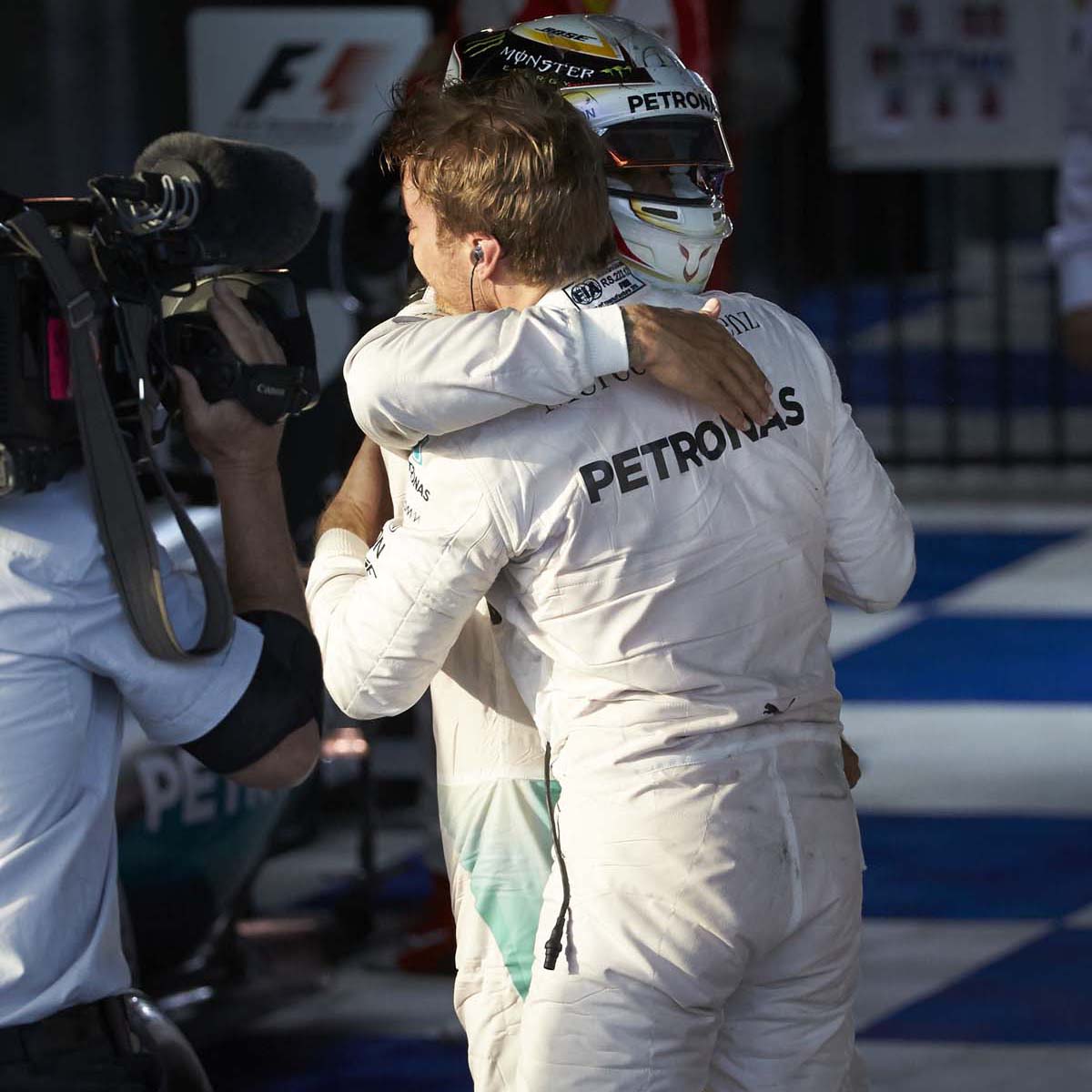 | 從去年季末以來,多久沒看到Hamilton和Rosberg抱抱了?你別急,只是翻臉的時候還沒到而已…… |