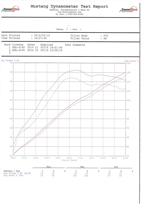 Golf 7 1.2TSI更可以明顯的看到扭力(藍線),拜渦輪增壓所賜2500-4000rpm之間提升了1.0kgm以上的表現,不過最大出力礙於排氣量限制僅有1hp提升,不過卻也是全區塊的提升,開起來有點像1.2升擴缸到1.3升的感受。